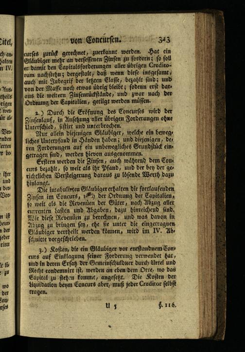3+ 3 curses zurück gerechnet, zuerkannt werden. Hat ein Gläubiger mehr an versessenen Zinsen zu fordern; so soll er damit den Capitalsforderungen aller übrigen Creditorum nachstehn; dergestalt, daß wenn diese insgesamt, auch mit Inbegrif der letzten Claffe, bezahlt sind; und von der Masse noch etwas übrig bleibt; sodenn erst dar. aus die weitern Zinsenrückstände, und zwar nach der Ordnung der Capitalien, getilgt werden müssen.