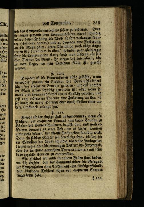 Hievon ist der einzige Fall ausgenommen, wenn ein Wächter, vor eröfnetem Concurs eine baare Caution zu Hånden des Gemeinschuldners bezahlt hat; und nach ers dfnetem Concurs zu einer Zeit, wo es dieser Caution nicht mehr bedarf, der Masse Pachtgelder schuldig wird. Denn ein solcher Pachter soll berechtigt seyn, die bey seis ner Ermißion der Masse schuldig bleibende Pachtgelder ( keinesweges aber die etwanigen Defecte des Inventarii, oder die im Gute gemachten Deteriorationen) auf seine baar gezahlte Caution zu compenfiren.