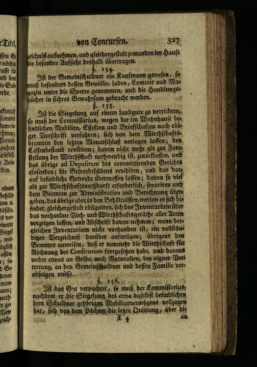 Ist die Siegelung auf einem Landgute zu verrichten, so muß der Commissarius, wegen der im Wohnhause bes findlichen Mobilien, Effekten und Briefschaften nach obis ger Vorschrift verfahren; sich von dem Wirthschaftss beamten den letzten Monatschluß vorlegen lassen; den Caffenbestand revidiren; davon nicht mehr als zur Forts stellung der Wirthschaft nothwendig ist, zurücklassen, und Das übrige ad Depofitum des committirenden Gerichts einsenden; die Getreydebddens revidiren, und das dars auf befindliche Getreyde übermessen lassen; davon so viel als zur Wirthschaftsnothdurft erforderlich, separiren und dem Beamten zur Administration und Berechnung übers geben, das übrige aber in den Behältnissen, worinn es sich bes findet, gleichergestalt obfigniren, sich das Inventarium über das vorhandne Vieh, und Wirthschaftsgeråthe aller Arten vorzeigen lassen, und Abschrift davon nehmen; wenn der gleichen Inventarium nicht vorhanden ist, ein vollstån diges Verzeichniß darüber anfertigen; übrigens dent Beamten anweisen, daß er nunmehr die Wirthschaft für Rechnung der Creditorum fortzusehen habe, und daraus weder etwas an Gelde, noch Naturalien, ben eigner Ber tretung, an den Gemeinschuldner und dessen Familie vers abfolgen müsse.