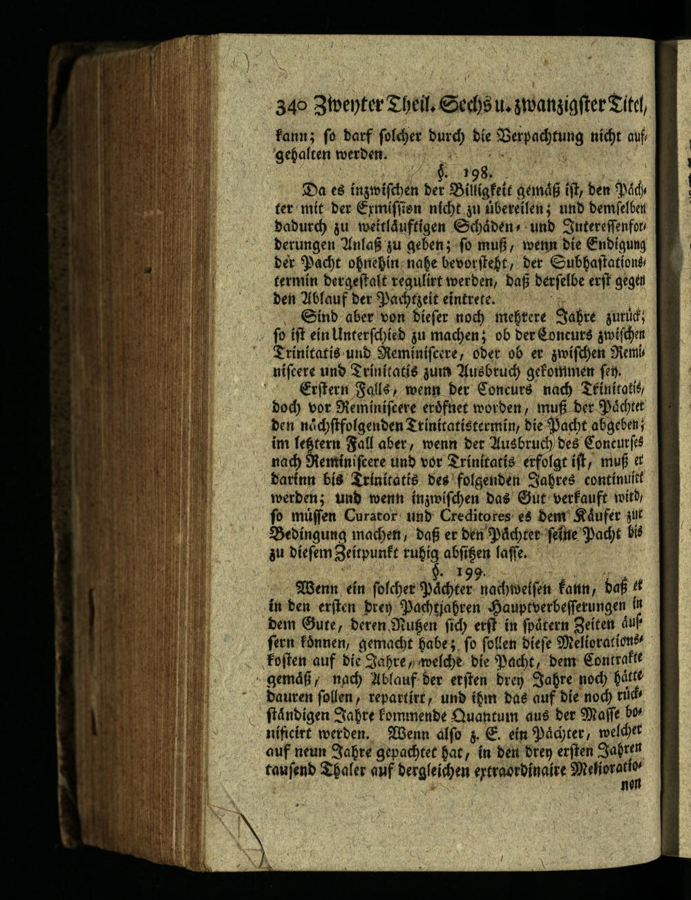 Erstern Falls, wenn der Concurs nach Trinitatis, doch vor Reminiscere erdfnet worden, muß der Pächter den nächstfolgenden Trinitatistermin, die Pacht abgeben; im legtern Fall aber, wenn der Ausbruch des Concurses nach Reminiscere und vor Trinitatis erfolgt ist, muß er darinn bis Trinitatis des folgenden Jahres continuitt werden; und wenn inzwischen das Gut verkauft wird, so müssen Curator und Creditores es dem Käufer zur Bedingung machen, daß er den Pächter seine Pacht bis zu diesem Zeitpunkt ruhig abfißen lasse. §. 199.