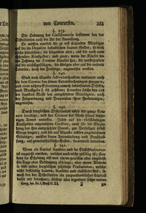 Wenn ein Capital liquidirt und im Claßifikationsurs tel angesezt worden, welches noch nicht gefällig ist; fon dern die Erhebung erst von einem gewissen oder ungewiss fen Tage oder Bedingung abhängt; oder wenn Alimen te und andre dergleichen jährliche Præftationes, welche nicht beständig dauern, liquidirt und claßificirt sind; so muß ben der Distribution ein proportionirliches Capital dafür mit berechnet; solches aber irgendwo sicher unters Corp, Jur. Fr. I. Buch II. Th. 3