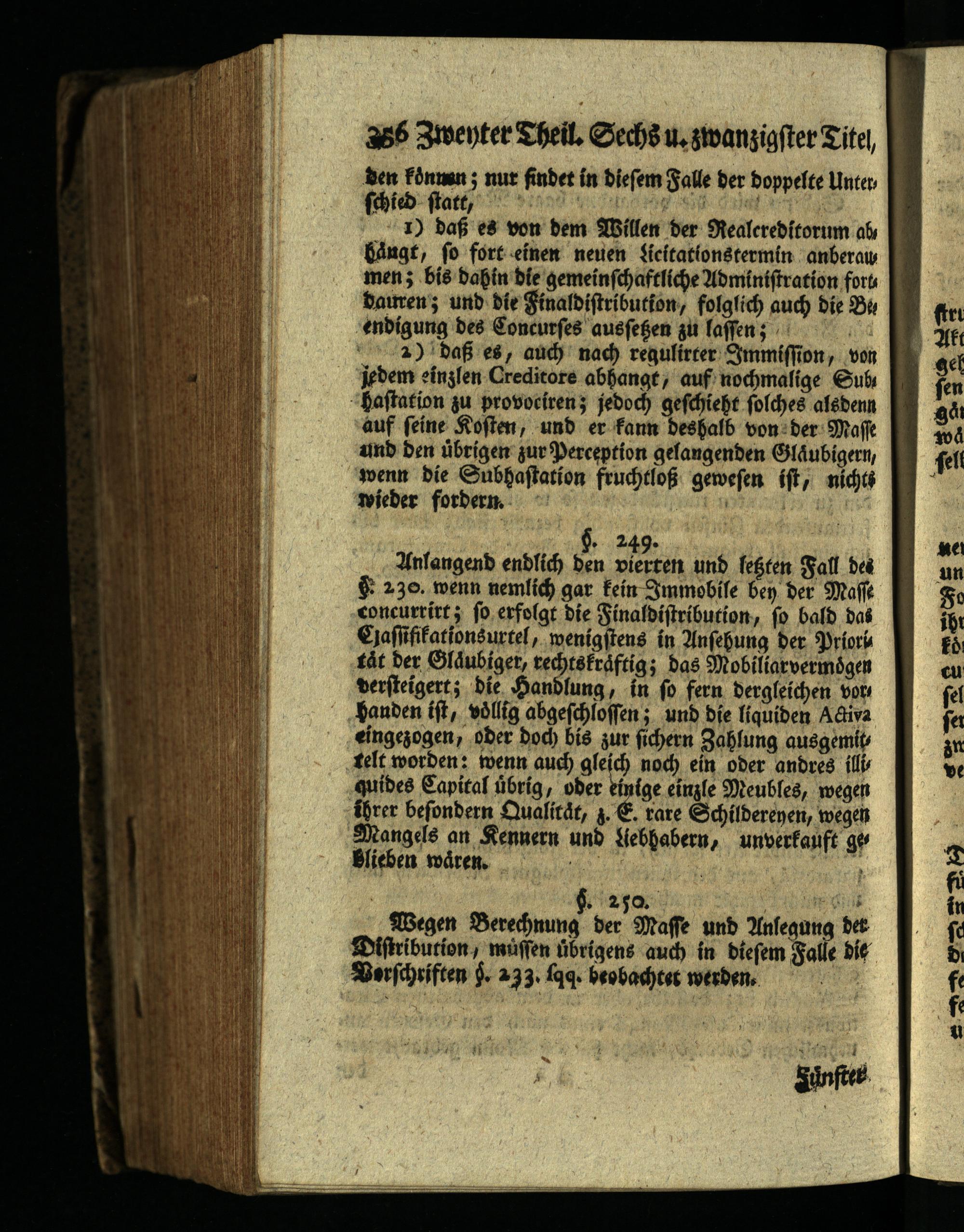 Unlangend endlich den vierten und letzten Fall des 230. wenn nemlich gar kein Immobile ben der Masse concurrirt; so erfolgt die Finaldistribution, so bald das Classifikationsurtel, wenigstens in Ansehung der Prioris tåt der Gläubiger, rechtskräftig; das Mobiliarvermögen versteigert; die Handlung, in so fern dergleichen vor handen ist, völlig abgeschlossen; und die liquiden Activa eingezogen, oder doch bis zur sichern Zahlung ausgemit telt worden: wenn auch gleich noch ein oder andres illi quides Capital übrig, oder einige einzle Meubles, wegen ihrer besondern Qualität, z. E. rare Schilderenen, wegen Mangels an Kennern und liebhabern, unverkauft ge Blieben wären.