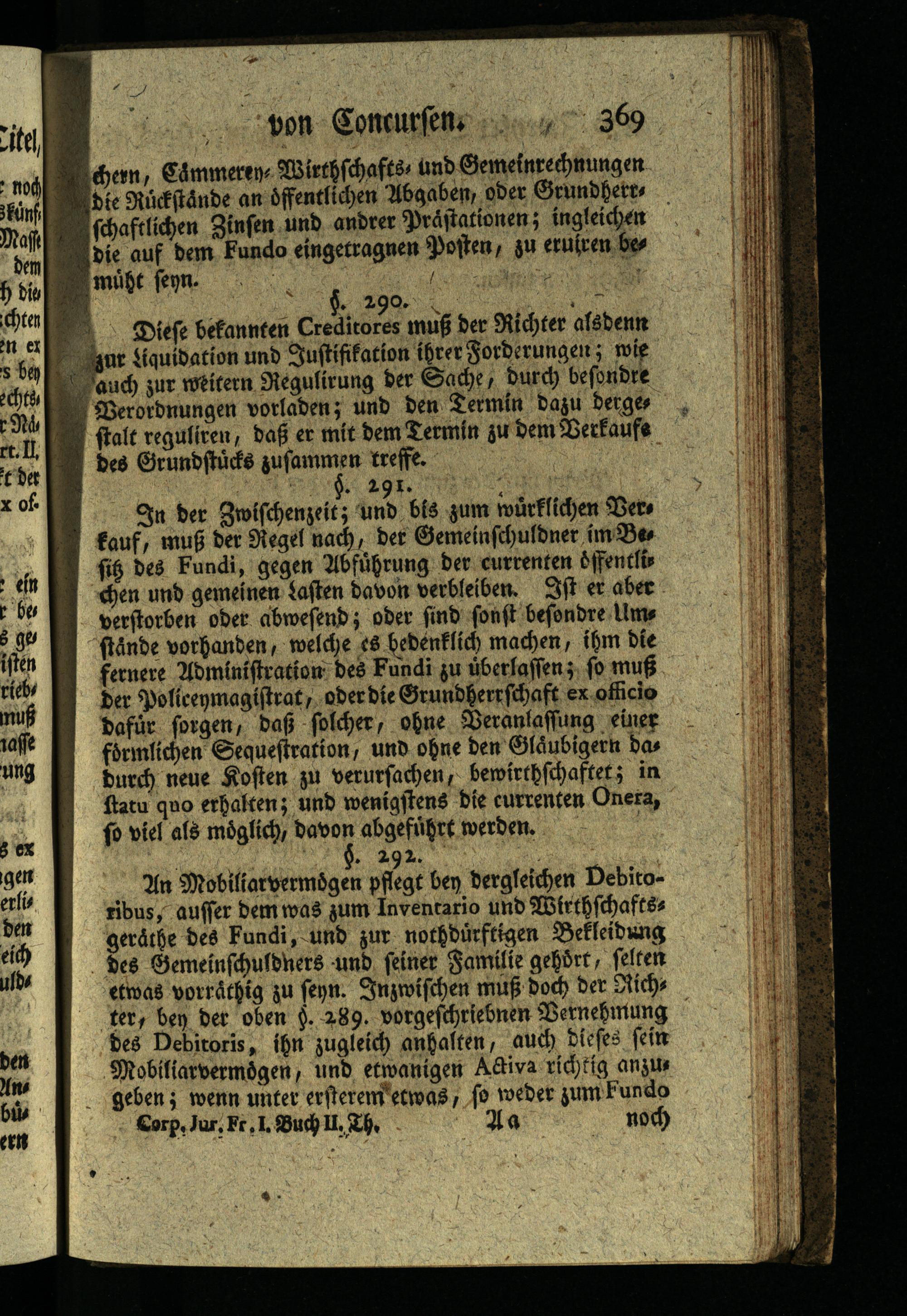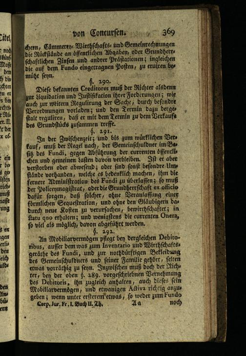 An Mobiliarvermögen pflegt ben dergleichen Debitoribus, auffer dem was zum Inventario und Wirthschaftss geråthe des Fundi, und zur nothdürftigen Bekleidung des Gemeinschuldhers und seiner Familie gehört, selten etwas vorräthig zu seyn. Inzwischen muß doch der Sichs ter, ben der oben§. 289. vorgeschriebnen Bernehmung des Debitoris, ihn zugleich anhalten, auch dieses sein Mobiliarvermögen, und etwanigen Activa richtig anzus geben; wenn unter ersterem etwas, so weder zum Fundo Corp, Jur. Fr. I. Buch II. Th.