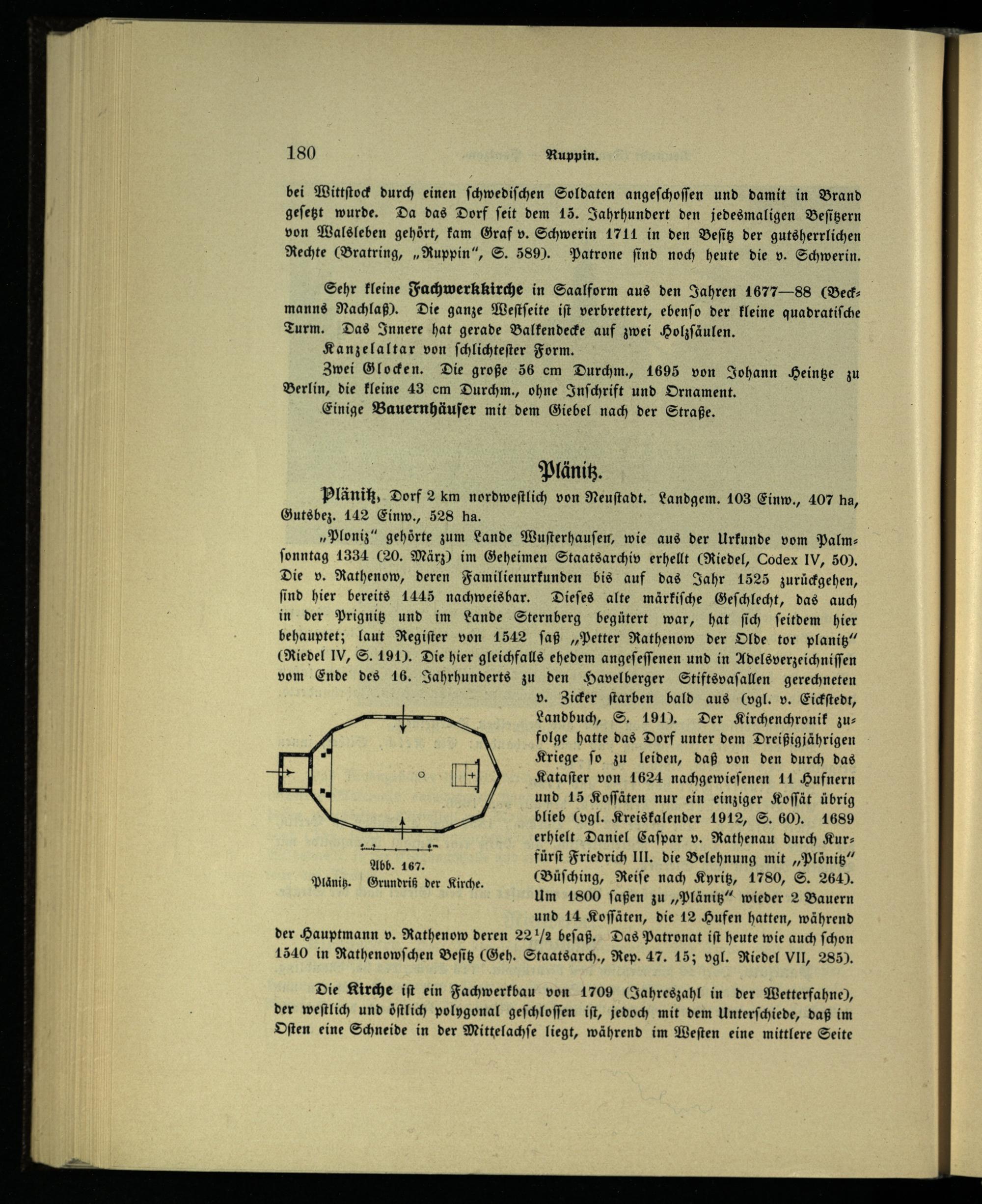 „Ploniz“ gehörte zum Lande Wuſterhauſen , wie aus der Urkunde vom Palmſonntag 1334(20. März) im Geheimen Staatsarchiv erhellt(Riedel, Codex IV , 50). Die v. Rathenow , deren Familienurkunden bis auf das Jahr 1525 zurückgehen, ſind hier bereits 1445 nachweisbar. Dieſes alte märkiſche Geſchlecht, das auch in der Prignitz und im Lande Sternberg begütert war, hat ſich ſeitdem hier behauptet; laut Regiſter von 1542 ſaß„Petter Rathenow der Olde tor planitz“ Riedel IV, S. 191). Die hier gleichfalls ehedem angeſeſſenen und in Adelsverzeichniſſen vom Ende des 16. Sahrhunderte zu den Havelberger Stiftsvafallen gerechneten v. Zicker ſtarben bald aus(vgl. v. Eickſtedt, Landbuch, S. 191). Der Kirchenchronik zufolge hatte das Dorf unter dem Dreißigjährigen Kriege ſo zu leiden, daß von den durch das Kataſter von 1624 nachgewieſenen 11 Hufnern und 15 Koſſäten nur ein einziger Koſſät übrig blieb(vgl. Kreiskalender 1912, S. 60). 1689 erhielt Daniel Caſpar v. Rathenau durch Kurfürſt Friedrich III. die Belehnung mit„Plönitz“ (Büſching, Reiſe nach Kyritz , 1780, S. 264). Um 1800 ſaßen zu„Plänitz“ wieder 2 Bauern und 14 Koſſäten, die 12 Hufen hatten, während der Hauptmann v. Rathenow deren 22!/2 beſaß. Das Patronat iſt heute wie auch ſchon 1540 in Rathenowſchen Beſitz(Geh. Staatsarch., Rep. 47. 15; vgl. Riedel Vll, 285).