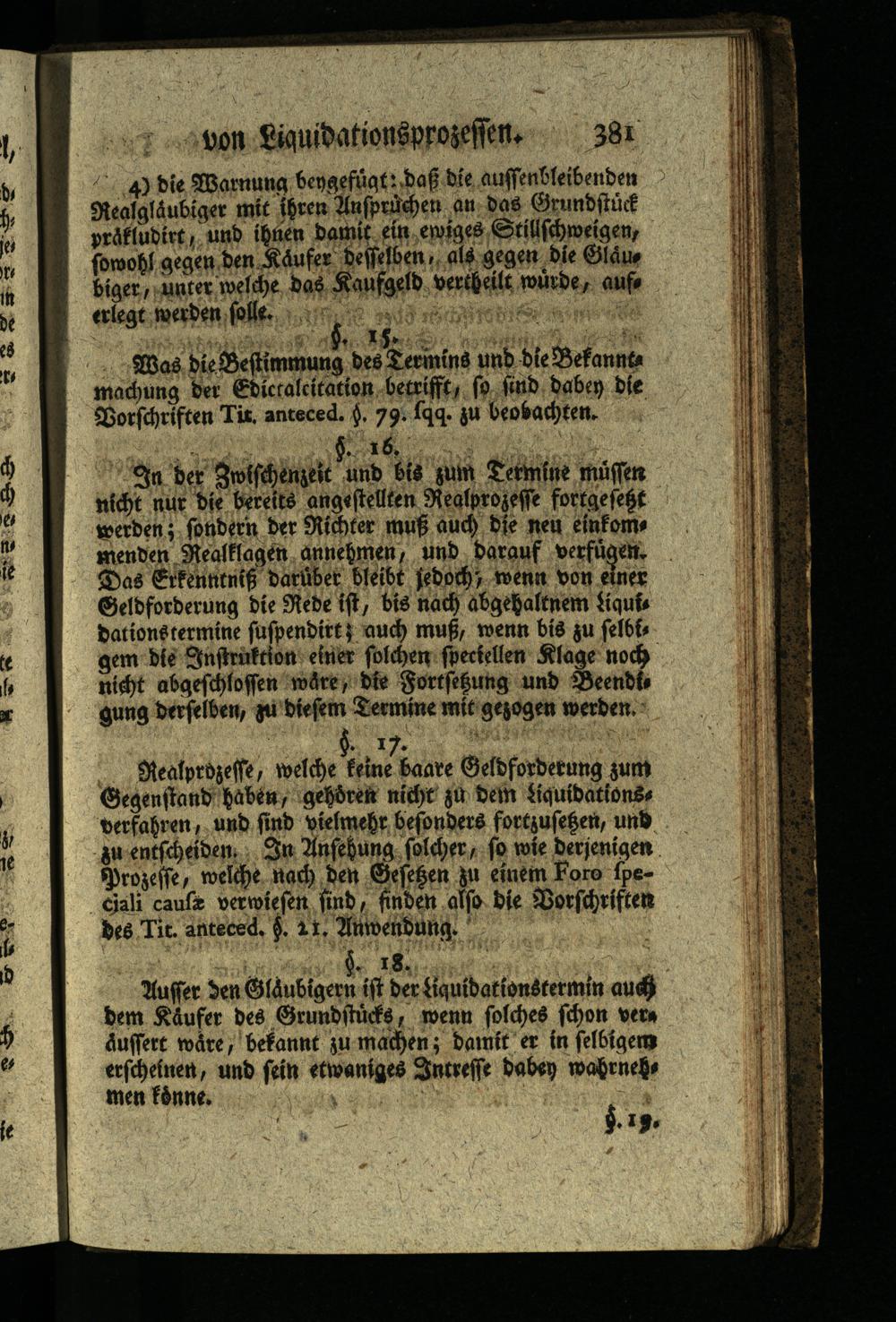 In der Zwischenzeit und bis zum Termine müssen nicht nur die bereits angestellten Realprozesse fortgesett werden; sondern der Richter muß auch die neu einkoms menden Realflagen annehmen, und darauf verfügen. Das Erkenntniß darüber bleibt jedoch, wenn von einer Geldforderung die Rede ist, bis nach abgehaltnem liqui dationstermine suspendirt; auch muß, wenn bis zu selbis gem die Instruktion einer solchen speciellen Klage noch nicht abgeschlossen wäre, die Fortseßung und Beendi gung derfelben, zu diesem Termine mit gezogen werden.