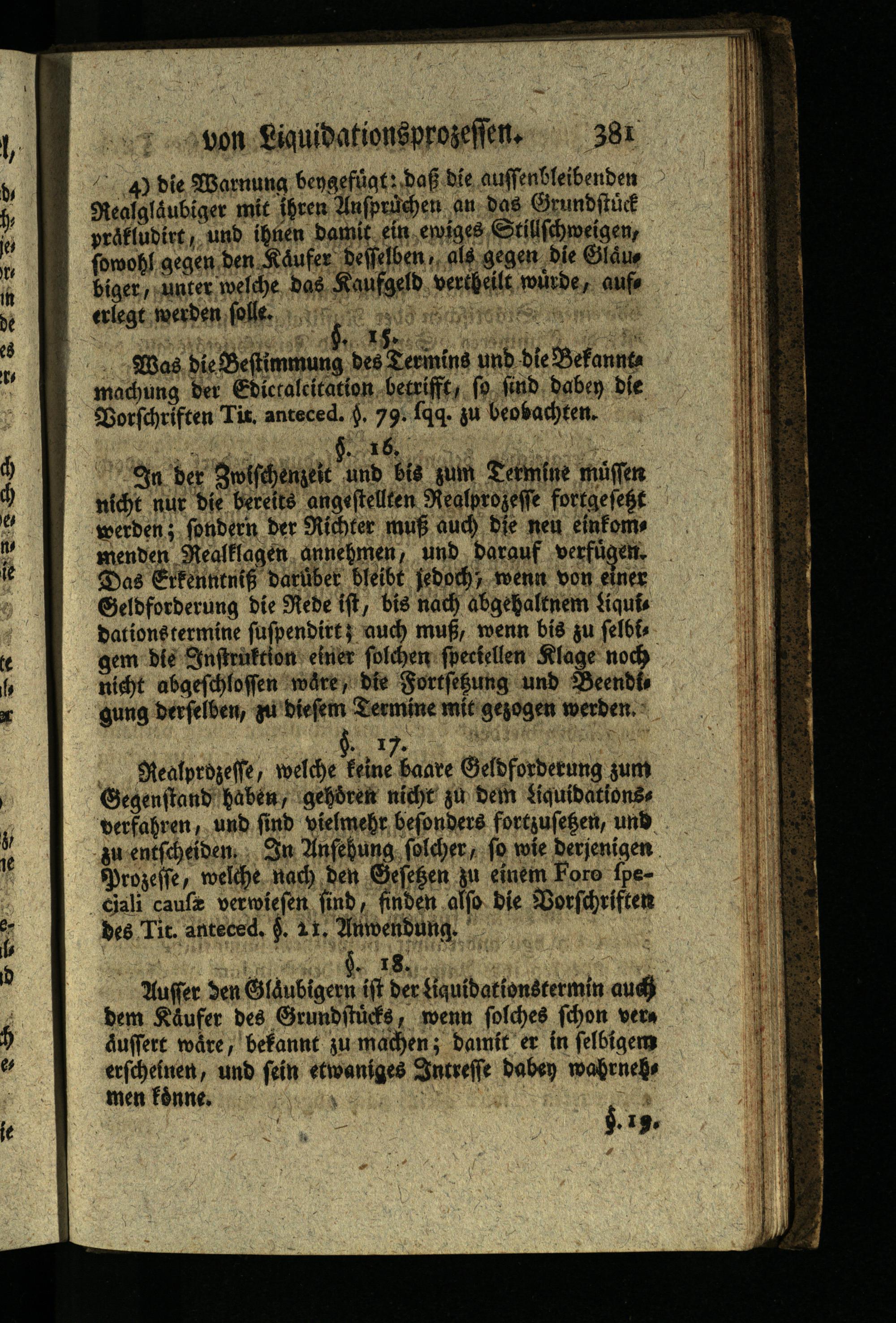 4) die Warnung beygefügt: daß die auffenbleibenden Realgläubiger mit ihren Ansprüchen an das Grundstück pråkludirt, und ihnen damit ein ewiges Stillschweigen, fowohl gegen den Käufer desselben, als gegen die Glaus biger, unter welche das Kaufgeld vertheilt würde, auf erlegt werden solle.tie do obm $ 15