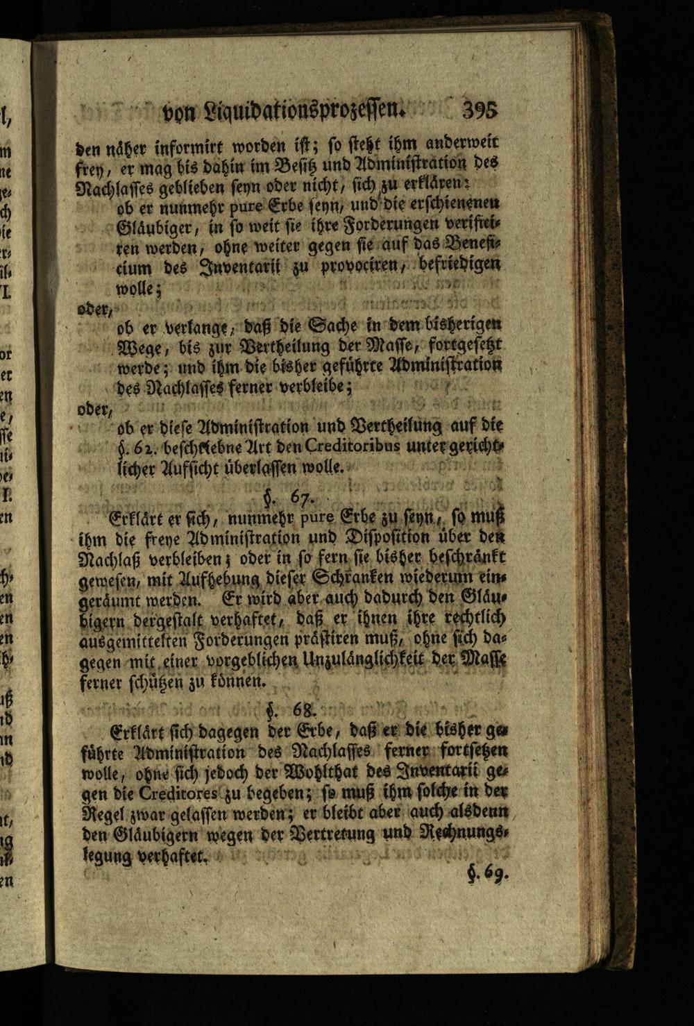 Erklärt er sich, nunmehr pure Erbe zu seyn, so muß ihm die freye Administration und Disposition über den Nachlaß verbleiben; oder in so fern sie bisher beschränkt gewesen, mit Aufhebung dieser Schranken wiederum eins geräumt werden. Er wird aber auch dadurch den Gläu bigern dergestalt verhaftet, daß er ihnen ihre rechtlich ausgemittelten Forderungen prästiren muß, ohne sich das gegen mit einer vorgeblichen Unzulänglichkeit der Masse ferner schüßen zu können.