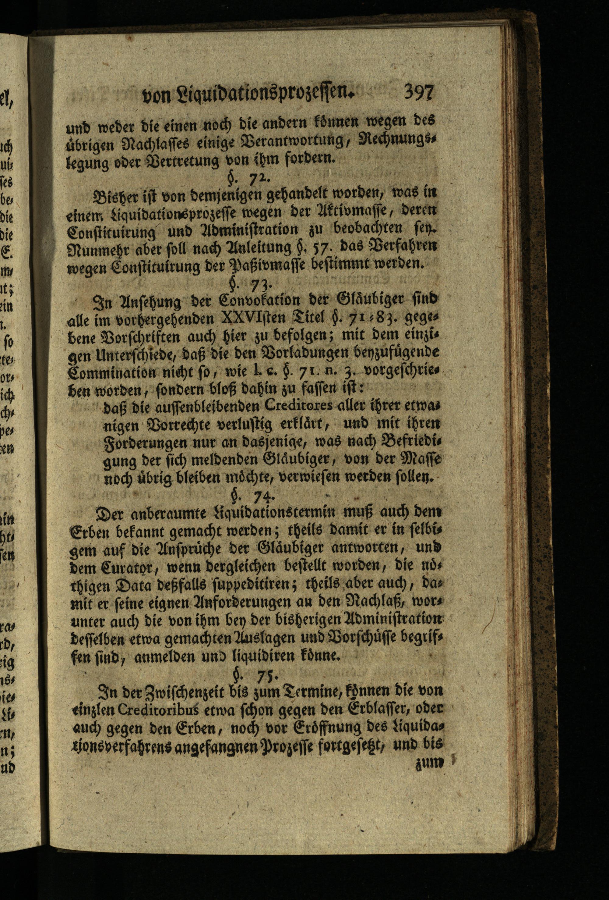Bisher ist von demjenigen gehandelt worden, was in einem Liquidationsprozesse wegen der Aktivmasse, deren Constituirung und Administration zu beobachten sen. Nunmehr aber soll nach Anleitung§. 57. das Verfahren wegen Constituirung der Paßivmasse bestimmt werden. §. 73.