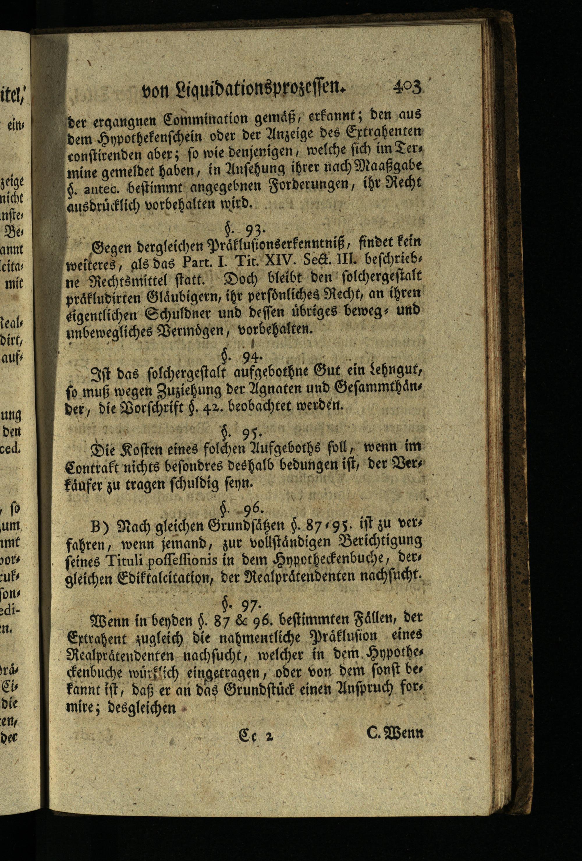 Gegen dergleichen Präffusionserkenntniß, findet kein weiteres, als das Part. I. Tit. XIV. Sect. III. beschrieb. ne Rechtsmittel statt. Doch bleibt den solchergestalt pråkludirten Gläubigern, ihr persönliches Recht, an ihren eigentlichen Schuldner und dessen übriges beweg und unbewegliches Vermögen, vorbehalten.