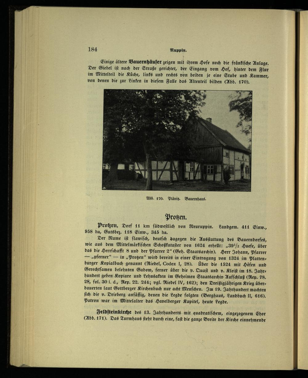 Der Name iſt ſlawiſch, deutſch dagegen die Ausſtattung des Bauerndorfes, wie aus dem Mittelmärkiſchen Schoßkataſter von 1624 erhellt:„391 Huefe, über das die Herrſchafft 8S und der Pfarrer 2“(Geh. Staatsarchiv). Herr Johann, Pfarrer —„pferner“— in„Protzen“ wird bereits in einer Eintragung von 1324 im Plattenburger Kopialbuch genannt(Riedel, Codex I, 28). Über die 1524 mit Höfen und Gerechtſamen belehnten Gadow, ferner über die v. Quaſt und v. Kleiſt im 18. Jahrhundert geben Kopiare und Lehnsakten im Geheimen Staatsarchiv Aufſchluß(Rep. 78. 28, fol. 30 i. d., Rep. 22. 244; vgl. Riedel IV, 162); den Dreißigjährigen Krieg überdauerten laut Gottberger Kirchenbuch nur acht Menſchen. Im 19. Jahrhundert machten ſich die v. Drieberg anſäſſig, denen die Legde folgten(Berghaus, Landbuch II, 616). Patron war im Mittelalter das Havelberger Kapitel, heute Legde.