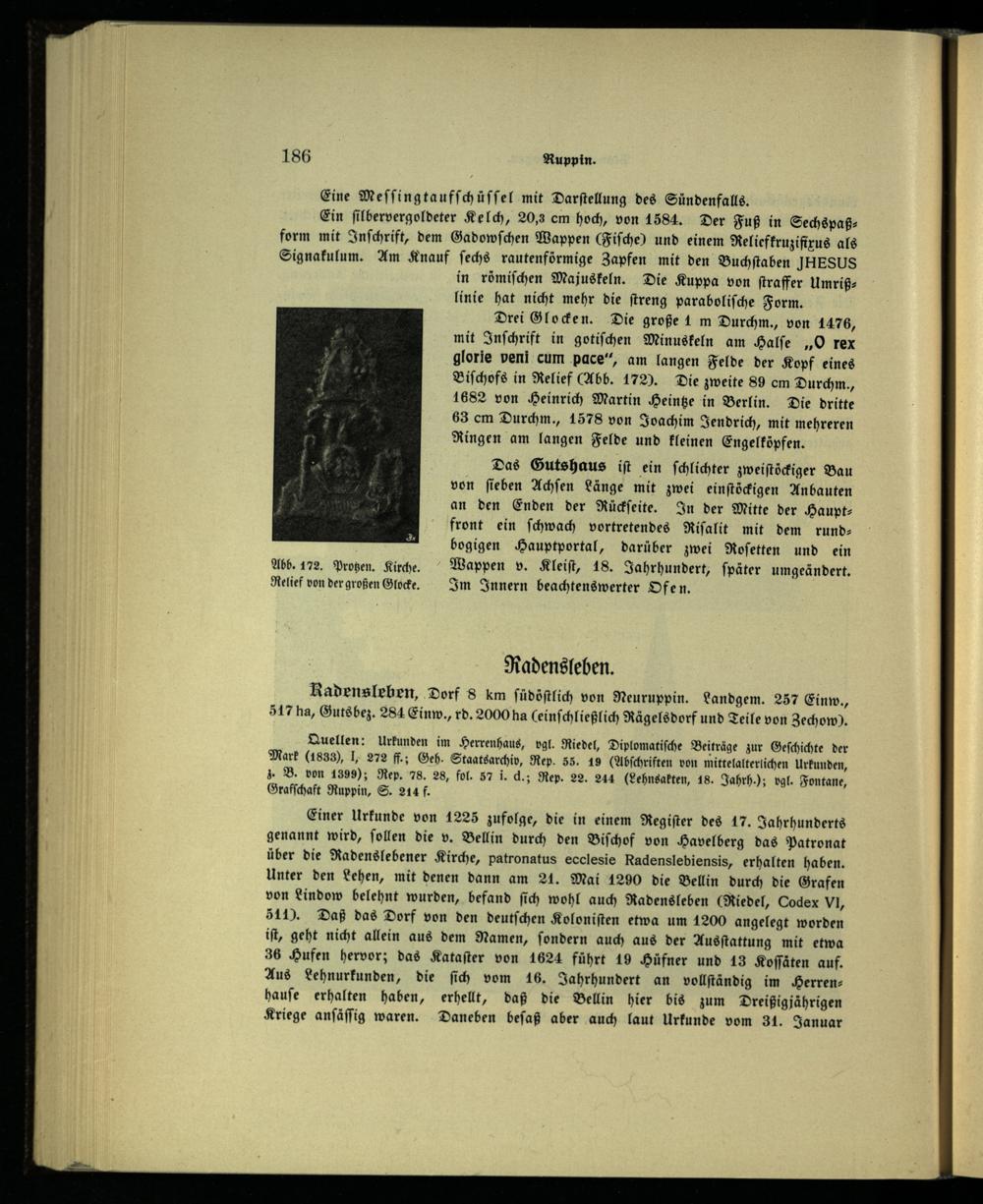 Einer Urkunde von 1225 zufolge, die in einem Regiſter des 17. Jahrhunderts genannt wird, ſollen die v. Bellin durch den Biſchof von Havelberg das Patronat über die Radenslebener Kirche, patronatus ecclesie Radenslebiensis, erhalten haben. Unter den Lehen, mit denen dann am 21. Mai 1290 die Bellin durch die Grafen von Lindow belehnt wurden, befand ſich wohl auch Radensleben(Riedel, Codex Vl, 511). Daß das Dorf von den deutſchen Koloniſten etwa um 1200 angelegt worden iſt, geht nicht allein aus dem Namen, ſondern auch aus der Ausſtattung mit etwa 36 Hufen hervor; das Kataſter von 1624 führt 19 Hüfner und 13 Koſſaäten auf. Aus Lehnurkunden, die ſich vom 16. Jahrhundert an vollſtändig im Herrenhauſe erhalten haben, erhellt, daß die Bellin hier bis zum Dreißigjährigen Kriege anſäſſig waren. Daneben beſaß aber auch laut Urkunde vom 31. Januar