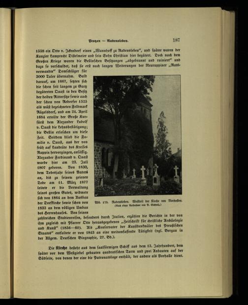 der Dorfkirche ſowie ſchon von Abb. 173. Radensleben. Weſtteil der Kirche von Nordoſten. 1833 an dem völligen Umbau(Nach einer Aufnahme von P. Eichholi.)