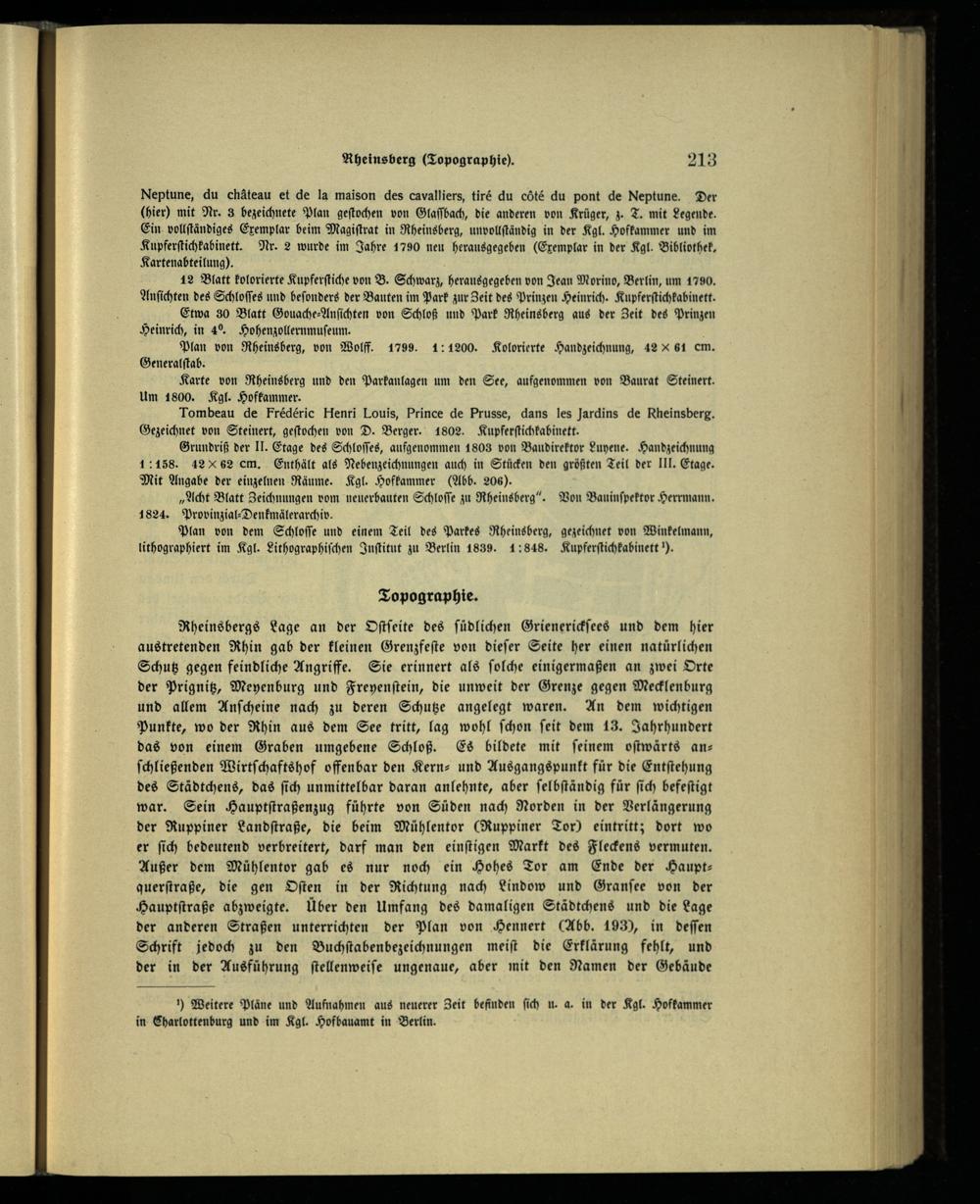Rheinsbergs Lage an der Oſtſeite des ſüdlichen Grienerickſees und dem hier austretenden Rhin gab der kleinen Grenzfeſte von dieſer Seite her einen natürlichen Schutz gegen feindliche Angriffe. Sie erinnert als ſolche einigermaßen an zwei Orte der Prignitz , Meyenburg und Freyenſtein , die unweit der Grenze gegen Mecklenburg und allem Anſcheine nach zu deren Schutze angelegt waren. An dem wichtigen Punkte, wo der Rhin aus dem See tritt, lag wohl ſchon ſeit dem 13. Jahrhundert das von einem Graben umgebene Schloß. Es bildete mit ſeinem oſtwärts anſchließenden Wirtſchaftshof offenbar den Kern- und Ausgangspunkt für die Entſtehung des Städtchens, das ſich unmittelbar daran anlehnte, aber ſelbſtändig für ſich befeſtigt war. Sein Hauptſtraßenzug führte von Süden nach Norden in der Verlängerung der Ruppiner Landſtraße, die beim Mühlentor(Ruppiner Tor) eintritt; dort wo er ſich bedeutend verbreitert, darf man den einſtigen Markt des Fleckens vermuten. Außer dem Mühlentor gab es nur noch ein Hohes Tor am Ende der Hauptquerſtraße, die gen Oſten in der Richtung nach Lindow und Granſee von der Hauptſtraße abzweigte. Über den Umfang des damaligen Städtchens und die Lage der anderen Straßen unterrichten der Plan von Hennert(Abb. 193), in deſſen Schrift jedoch zu den Buchſtabenbezeichnungen meiſt die Erklärung fehlt, und der in der Ausführung ſtellenweiſe ungenaue, aber mit den Namen der Gebäude