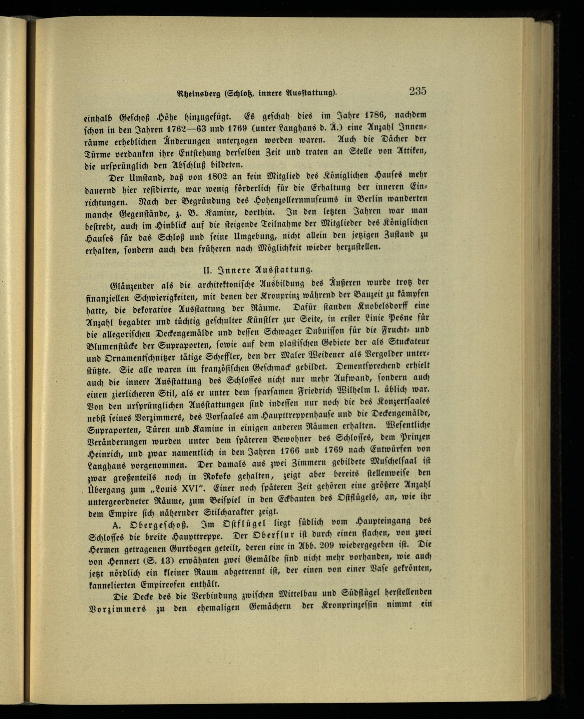 Glänzender als die architektoniſche Ausbildung des Außeren wurde trotz der finanziellen Schwierigkeiten, mit denen der Kronprinz während der Bauzeit zu kämpfen hatte, die dekorative Ausſtattung der Räume. Dafür ſtanden Knobelsdorff eine Anzahl begabter und tüchtig geſchulter Künſtler zur Seite, in erſter Linie Pesne für die allegoriſchen Deckengemälde und deſſen Schwager Dubuiſſon für die Frucht- und Blumenſtücke der Supraporten, ſowie auf dem plaſtiſchen Gebiete der als Stuckateur und Ornamentſchnitzer tätige Scheffler, den der Maler Weidener als Vergolder unterſtützte. Sie alle waren im franzöſiſchen Geſchmack gebildet. Dementſprechend erhielt auch die innere Ausſtattung des Schloſſes nicht nur mehr Aufwand, ſondern auch einen zierlicheren Stil, als er unter dem ſparſamen Friedrich Wilhelm J. üblich war. Von den urſprünglichen Ausſtattungen ſind indeſſen nur noch die des Konzertſaales nebſt ſeines Vorzimmers, des Vorſaales am Haupttreppenhauſe und die Deckengemälde, Supraporten, Türen und Kamine in einigen anderen Räumen erhalten. Weſentliche Veränderungen wurden unter dem ſpäteren Bewohner des Schloſſes, dem Prinzen Heinrich, und zwar namentlich in den Jahren 1766 und 1769 nach Entwürfen von Langhans vorgenommen. Der damals aus zwei Zimmern gebildete Muſchelſaal iſt zwar großenteils noch in Rokoko gehalten, zeigt aber bereits ſtellenweiſe den . Übergang zum„Louis XVI“. Einer noch ſpäteren Zeit gehören eine größere Anzahl untergeordneter Räume, zum Beiſpiel in den Eckbauten des Oſtflügels, an, wie ihr dem Empire ſich nähernder Stilcharakter zeigt.