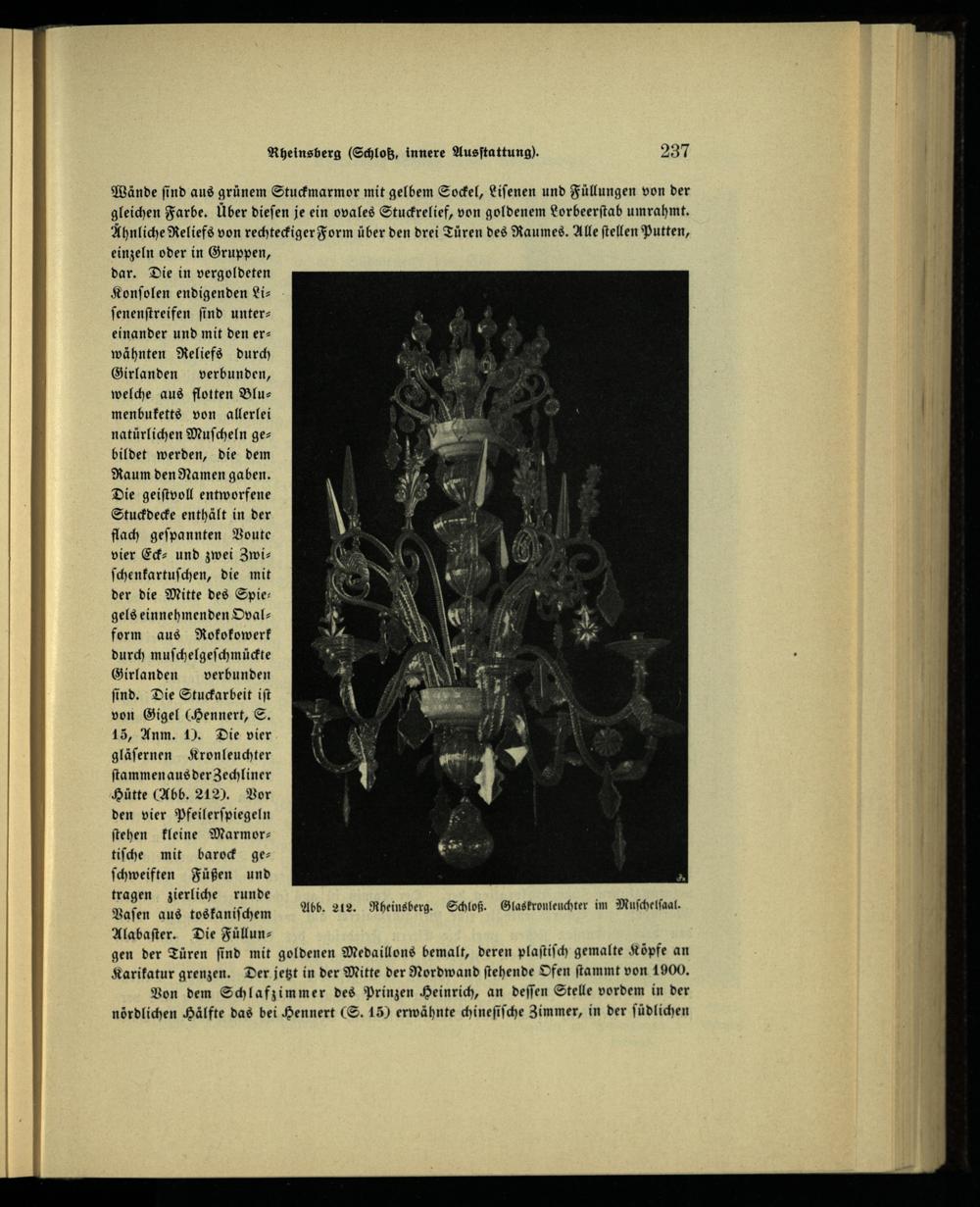 ſenenſtreifen ſind untereinander und mit den erwähnten Reliefs durch Girlanden verbunden, welche aus flotten Blumenbuketts von allerlei natürlichen Muſcheln gebildet werden, die dem Raum den Namen gaben. Die geiſtvoll entworfene Stuckdecke enthält in der flach geſpannten Voute vier Eck- und zwei Zwiſchenkartuſchen, die mit der die Mitte des Spiegels einnehmenden Ovalform aus Rokokowerk durch muſchelgeſchmückte Girlanden verbunden ſind. Die Stuckarbeit iſt von Sigel(Hennert, S. 15, Anm. 1). Die vier gläſernen Kronleuchter ſtammen aus der Zechliner Hütte (Abb. 212). Vor den vier Pfeilerſpiegeln ſtehen kleine Marmortiſche mit barock geſchweiften Füßen und tragen zierliche runde Vaſen aus toskaniſchem Alabaſter. Die Füllun