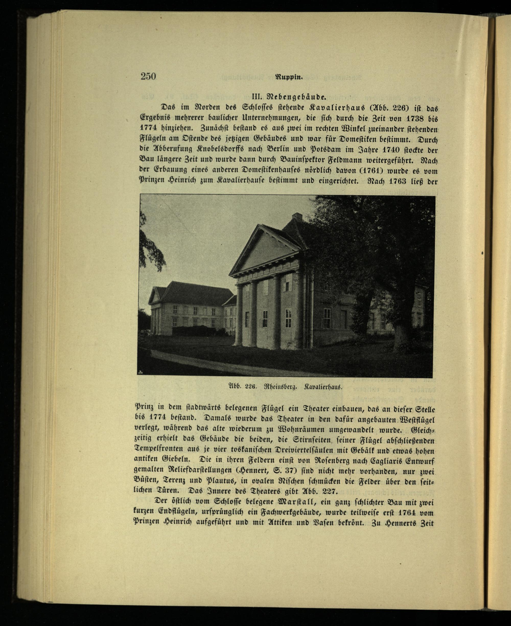 Das im Norden des Schloſſes ſtehende Kavalierhaus(Abb. 226) iſt das Ergebnis mehrerer baulicher Unternehmungen, die ſich durch die Zeit von 1738 bis 1774 hinziehen. Zunächſt beſtand es aus zwei im rechten Winkel zueinander ſtehenden Flügeln am Oſtende des jetzigen Gebäudes und war für Domeſtiken beſtimmt. Durch die Abberufung Knobelsdorffs nach Berlin und Potsdam im Jahre 1740 ſtockte der Bau längere Zeit und wurde dann durch Bauinſpektor Feldmann weitergeführt. Nach der Erbauung eines anderen Domeſtikenhauſes nördlich davon(1761) wurde es vom Prinzen Heinrich zum Kavalierhauſe beſtimmt und eingerichtet. Nach 1763 ließ der