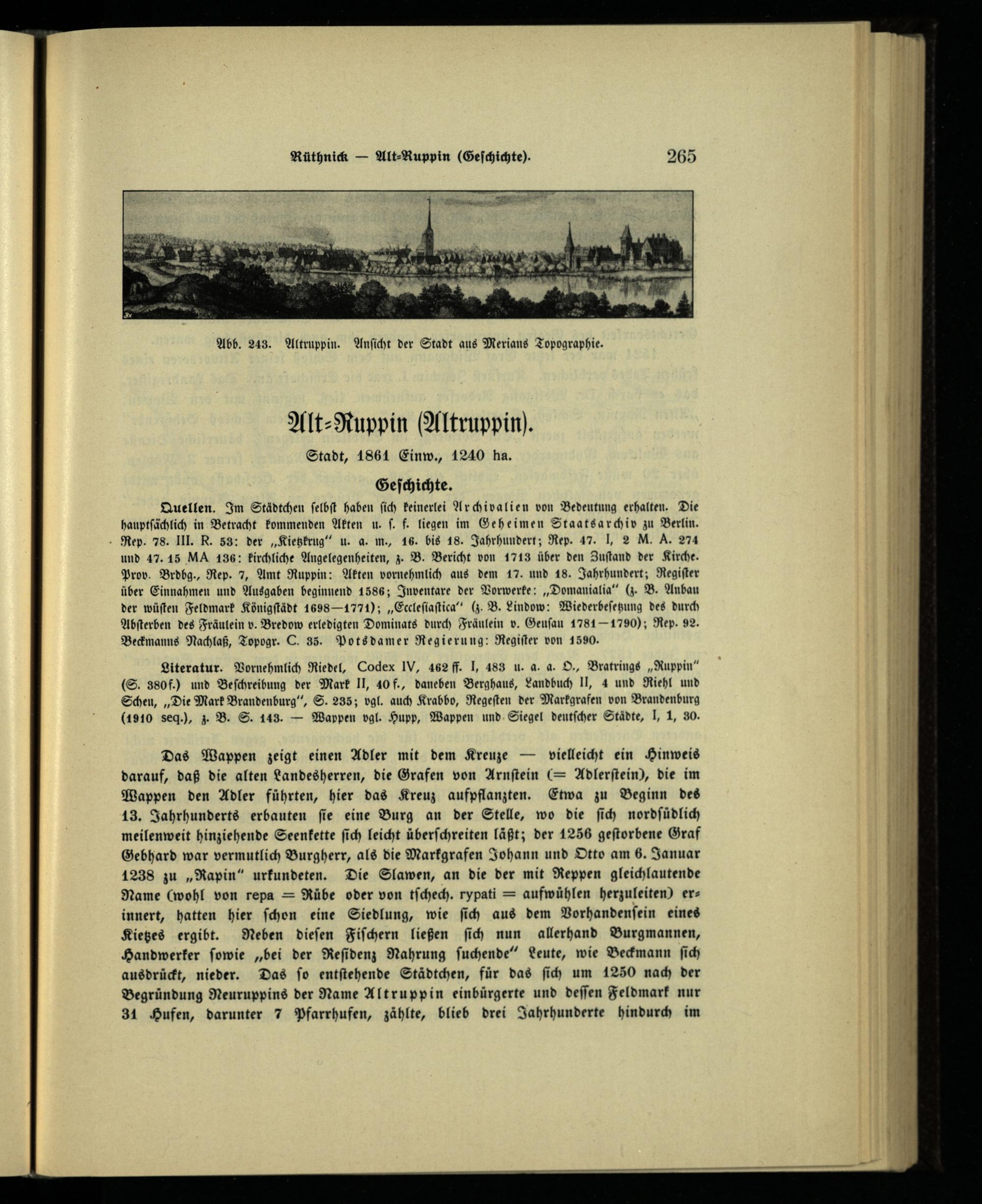 Literatur. Vornehmlich Riedel, Codex IV , 462 ff. I, 483 u. a. a4. O., Bratrings„Ruppin“ (S. 3805) und Beſchreibung der Mark II, 40 f., daneben Berghaus, Landbuch Il, 4 und Riehl und Scheu,„Die Mark Brandenburg“, S. 235; vgl. auch Krabbo, Regeſten der Markgrafen von Brandenburg (1910 seq.), z. B. S. 143.— Wappen vgl. Hupp, Wappen und Siegel deutſcher Städte, I, 1, 30.