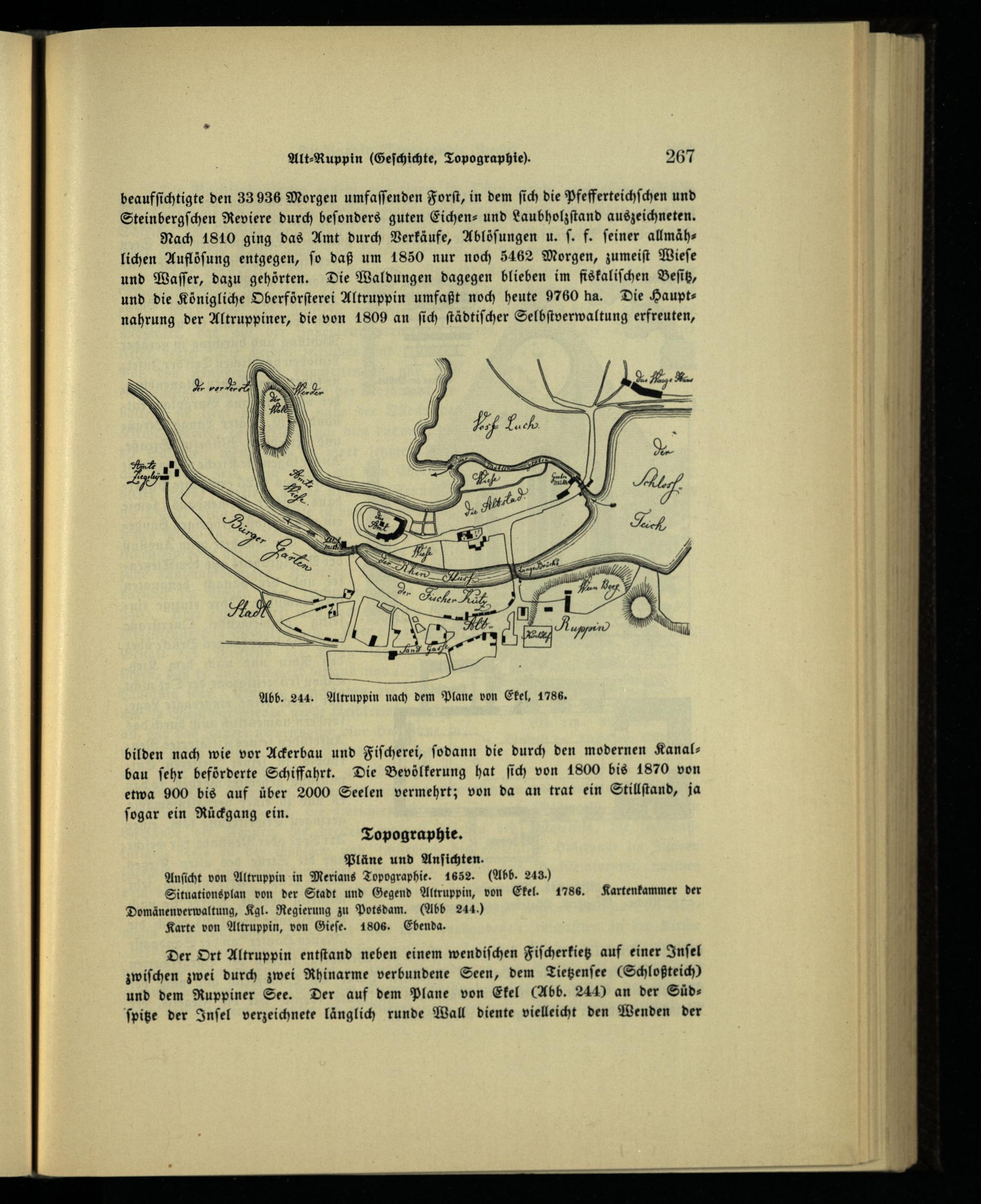 bilden nach wie vor Ackerbau und Fiſcherei, ſodann die durch den modernen Kanalbau ſehr beförderte Schiffahrt. Die Bevölkerung hat ſich von 1800 bis 1870 von etwa 900 bis auf über 2000 Seelen vermehrt; von da an trat ein Stillſtand, ja ſogar ein Rückgang ein. Topographie. Pläne und Anſichten. Anſicht von Altruppin in Merians Topographie. 1652.(Abb. 243.) Situationsplan von der Stadt und Gegend Altruppin , von Ekel. 1786. Kartenkammer der