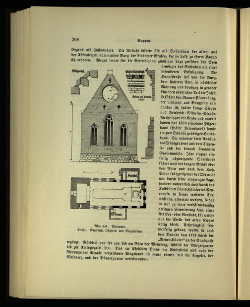 Richtung und durchzog in gerader Linie den nördlichen Teil der Inſel; ſie führte den Namen Planenburg, der vielleicht aus Burgplan entſtanden iſt, ſpäter Lange Straße und Friedrich: Wilhelm Straße. An ihr lagen die Kirche und unweit davon das 1525 erwähnte Pilgerhaus(ſpäter Armenhaus) ſowie ein zum Schloſſe gehöriges Hundehaus. Sie mündete beim Ausfluß des Mühlgrabens aus dem Tietzenſee und der danach benannten Grabenmühle. Ihre einzige einſeitig abzweigende Querſtraße führte nach der langen Brücke über den Rhin und nach dem Kietz. Schon frühzeitig war der Ort nicht nur durch ſeine eingeengte Lage, ſondern namentlich auch durch das Aufblühen ſeines Filialortes Neu ruppin in ſeiner weiteren Ent— wicklung gehemmt worden, ſo daß es nur zu einer verhältnismäßig geringen Erweiterung kam, einer Art Vor⸗ oder Neuſtadt, für welche nur die Stelle des alten Kietzes übrig blieb. Urſprünglich ſehr winkelig gebaut, wurde ſie nach dem Brande von 1791 durch die