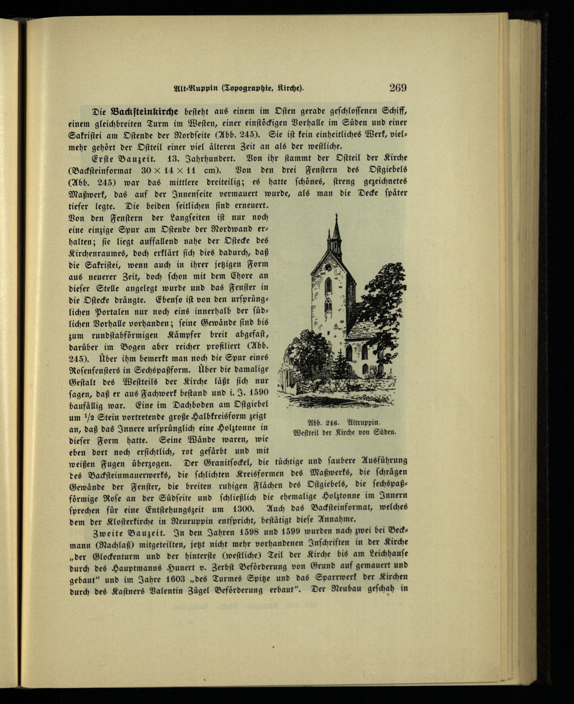 Erſte Bauzeit. 13. Jahrhundert. Von ihr ſtammt der Oſtteil der Kirche (Backſteinformat 30 X 14 X 11 em). Von den drei Fenſtern des Oſtgiebels (Abb. 245) war das mittlere dreiteilig; es hatte ſchönes, ſtreng gezeichnetes Maßwerk, das auf der Innenſeite vermauert wurde, als man die Decke ſpäter tiefer legte. Die beiden ſeitlichen ſind erneuert. Von den Fenſtern der Langſeiten iſt nur noch eine einzige Spur am Oſtende der Nordwand erhalten; ſie liegt auffallend nahe der Oſtecke des Kirchenraumes, doch erklärt ſich dies dadurch, daß die Sakriſtei, wenn auch in ihrer jetzigen Form aus neuerer Zeit, doch ſchon mit dem Chore an dieſer Stelle angelegt wurde und das Fenſter in die Oſtecke drängte. Ebenſo iſt von den urſprünglichen Portalen nur noch eins innerhalb der ſüdlichen Vorhalle vorhanden; ſeine Gewände ſind bis zum rundſtabförmigen Kämpfer breit abgefaſt, darüber im Bogen aber reicher profiliert(Abb. 245). Über ihm bemerkt man noch die Spur eines Roſenfenſters in Sechspaßform. Über die damalige Geſtalt des Weſtteils der Kirche läßt ſich nur ſagen, daß er aus Fachwerk beſtand und i. J. 1590 baufällig war. Eine im Dachboden am Oſtgiebel um!/2 Stein vortretende große Halbkreisform zeigt an, daß das Innere urſprünglich eine Holztonne in dieſer Form hatte. Seine Wände waren, wie eben dort noch erſichtlich, rot gefärbt und mit weißen Fugen überzogen. Der Granitſockel, die tüchtige und ſaubere Ausführung des Backſteinmauerwerks, die ſchlichten Kreisformen des Maßwerks, die ſchrägen Gewände der Fenſter, die breiten ruhigen Flächen des Oſtgiebels, die ſechspaßförmige Roſe an der Südſeite und ſchließlich die ehemalige Holztonne im Innern ſprechen für eine Entſtehungszeit um 1300. Auch das Backſteinformat, welches dem der Kloſterkirche in Neuruppin entſpricht, beſtätigt dieſe Annahme.