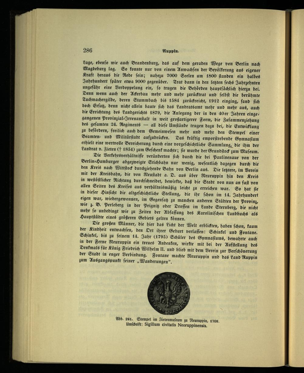 Die Verkehrsverhältniſſe veränderten ſich durch die bei Paulinenaue von der Berlin⸗ -Hamburger abgezweigte Stichbahn nur wenig, weſentlich dagegen durch die den Kreis nach Wittſtock durchziehende Bahn von Berlin aus. Die letztere, im Verein mit der Kreisbahn, die von Neuſtadt a. D. aus über Neuruppin hin den Kreis in weſtöſtlicher Richtung durchſchneidet, bewirkte, daß die Stadt von nun an faſt von allen Seiten des Kreiſes aus verhältnismäßig leicht zu erreichen war. So hat ſie in dieſer Hinſicht die altgeſchichtliche Stellung, die ihr ſchon im 14. Jahrhundert eigen war, wiedergewonnen, im Gegenſatz zu manchen anderen Städten der Provinz, wie z. B. Perleberg in der Prignitz oder Droſſen im Lande Sternberg, die nicht mehr ſo unbedingt wie zu Zeiten der Abfaſſung des Karoliniſchen Landbuchs als Hauptſtädte eines größeren Gebiets gelten können.