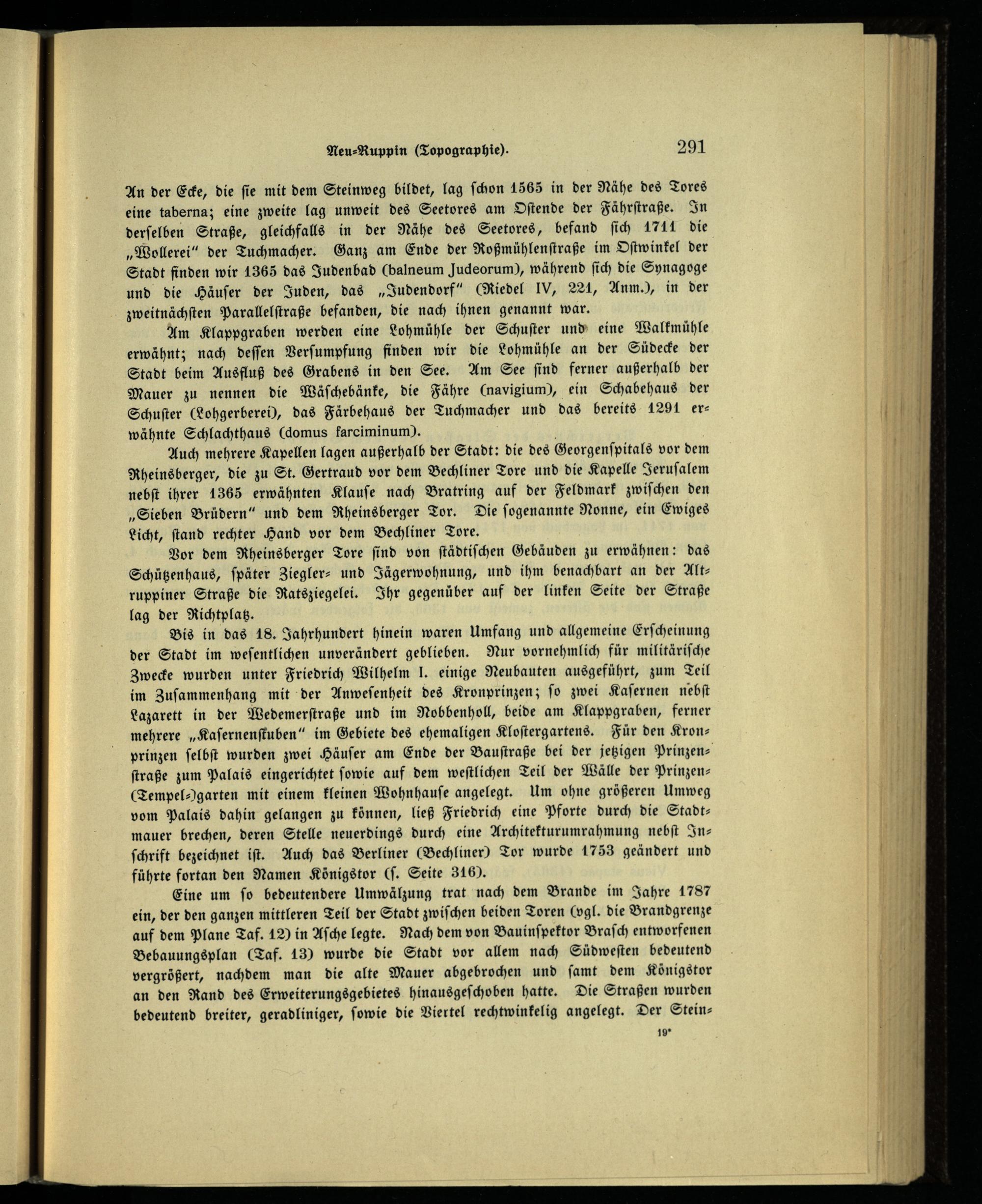 Auch mehrere Kapellen lagen außerhalb der Stadt: die des Georgenſpitals vor dem Rheinsberger , die zu St. Gertraud vor dem Bechliner Tore und die Kapelle Jeruſalem nebſt ihrer 1365 erwähnten Klauſe nach Bratring auf der Feldmark zwiſchen den „Sieben Brüdern“ und dem Rheinsberger Tor. Die ſogenannte Nonne, ein Ewiges Licht, ſtand rechter Hand vor dem Bechliner Tore.