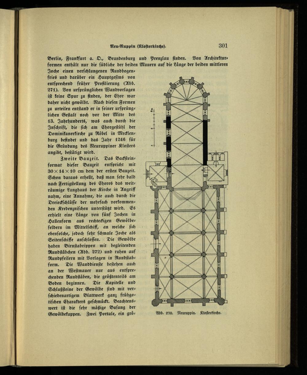 Berlin , Frankfurt a. O., Brandenburg und Prenzlau finden. Von Architektur­formen enthält nur die ſüdliche der beiden Mauern auf die Länge der beiden mittleren Joche einen verſchlungenen Rundbogen­fries und darüber ein Hauptgeſims von entſprechend früher Profilierung(Abb. 271). Von urſprünglichen Wandvorlagen iſt keine Spur zu finden, der Chor war daher nicht gewölbt. Nach dieſen Formen zu urteilen entſtand er in ſeiner urſprüng­lichen Geſtalt noch vor der Mitte des 13. Jahrhunderts, was auch durch die Inſchrift, die ſich am Chorgeſtühl der Dominikanerkirche zu Röbel in Mecklen­ burg befindet und das Jahr 1246 für die Gründung des Neuruppiner Kloſters angibt, beſtätigt wird.