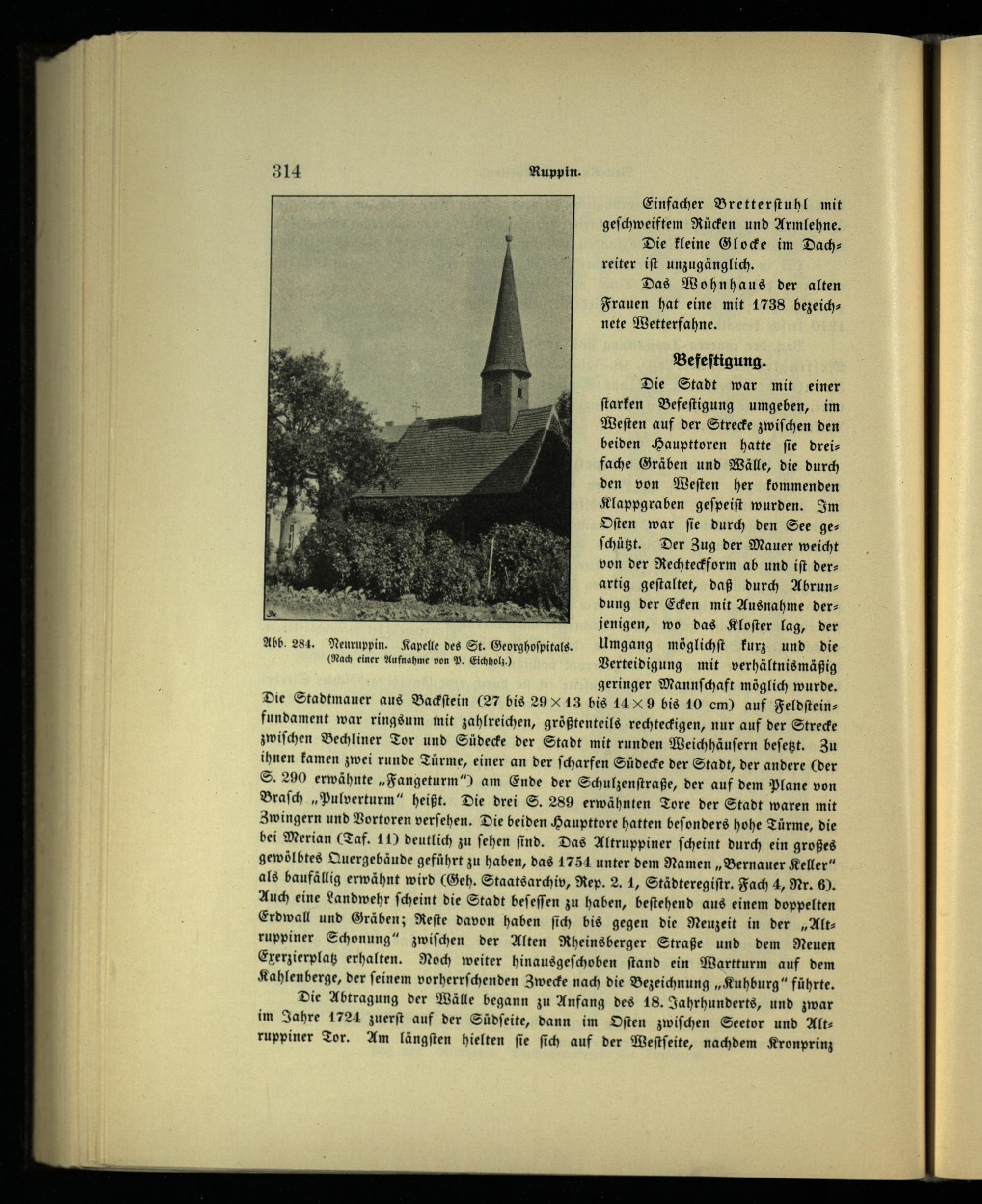 Befeſtigung. Die Stadt war mit einer ſtarken Befeſtigung umgeben, im Weſten auf der Strecke zwiſchen den beiden Haupttoren hatte ſie dreifache Gräben und Wälle, die durch den von Weſten her kommenden Klappgraben geſpeiſt wurden. Im Oſten war ſie durch den See geſchützt. Der Zug der Mauer weicht von der Rechteckform ab und iſt derartig geſtaltet, daß durch Abrun⸗— dung der Ecken mit Ausnahme der: jenigen, wo das Kloſter lag, der Abb. 284. Neuruppin. Kapelle des St. Georghoſpitalz. Umgang möglichſt kurz und die (ach einer Aufnahme von P. Eichholz.) Verteidigung mit verhältnismäßig geringer Mannſchaft möglich wurde. Die Stadtmauer aus Backſtein(27 bis 29* 13 bis 14 X9 bis 10 em) auf Feldſteinfundament war ringsum mit zahlreichen, größtenteils rechteckigen, nur auf der Strecke zwiſchen Bechliner Tor und Südecke der Stadt mit runden Weichhäuſern beſetzt. Zu ihnen kamen zwei runde Türme, einer an der ſcharfen Südecke der Stadt, der andere(der S. 290 erwähnte„Fangeturm“) am Ende der Schulzenſtraße, der auf dem Plane von Braſch„Pulverturm“ heißt. Die drei S. 289 erwähnten Tore der Stadt waren mit Zwingern und Vortoren verſehen. Die beiden Haupttore hatten beſonders hohe Türme, die bei Merian(Taf. 1) deutlich zu ſehen ſind. Das Altruppiner ſcheint durch ein großes gewölbtes Quergebäude geführt zu haben, das 1754 unter dem Namen„Bernauer Keller“ als baufällig erwähnt wird(Geh. Staatsarchiv, Rep. 2. 1, Städteregiſtr. Fach 4, Nr. 6). Auch eine Landwehr ſcheint die Stadt beſeſſen zu haben, beſtehend aus einem doppelten Erdwall und Gräben; Reſte davon haben ſich bis gegen die Neuzeit in der„Altruppiner Schonung“ zwiſchen der Alten Rheinsberger Straße und dem Neuen Exerzierplatz erhalten. Noch weiter hinausgeſchoben ſtand ein Wartturm auf dem Kahlenberge, der ſeinem vorherrſchenden Zwecke nach die Bezeichnung„Kuhburg“ führte. Die Abtragung der Wälle begann zu Anfang des 18. Jahrhunderts, und zwar im Jahre 1724 zuerſt auf der Südſeite, dann im Oſten zwiſchen Seetor und Altruppiner Tor. Am längſten hielten ſie ſich auf der Weſtſeite, nachdem Kronprinz