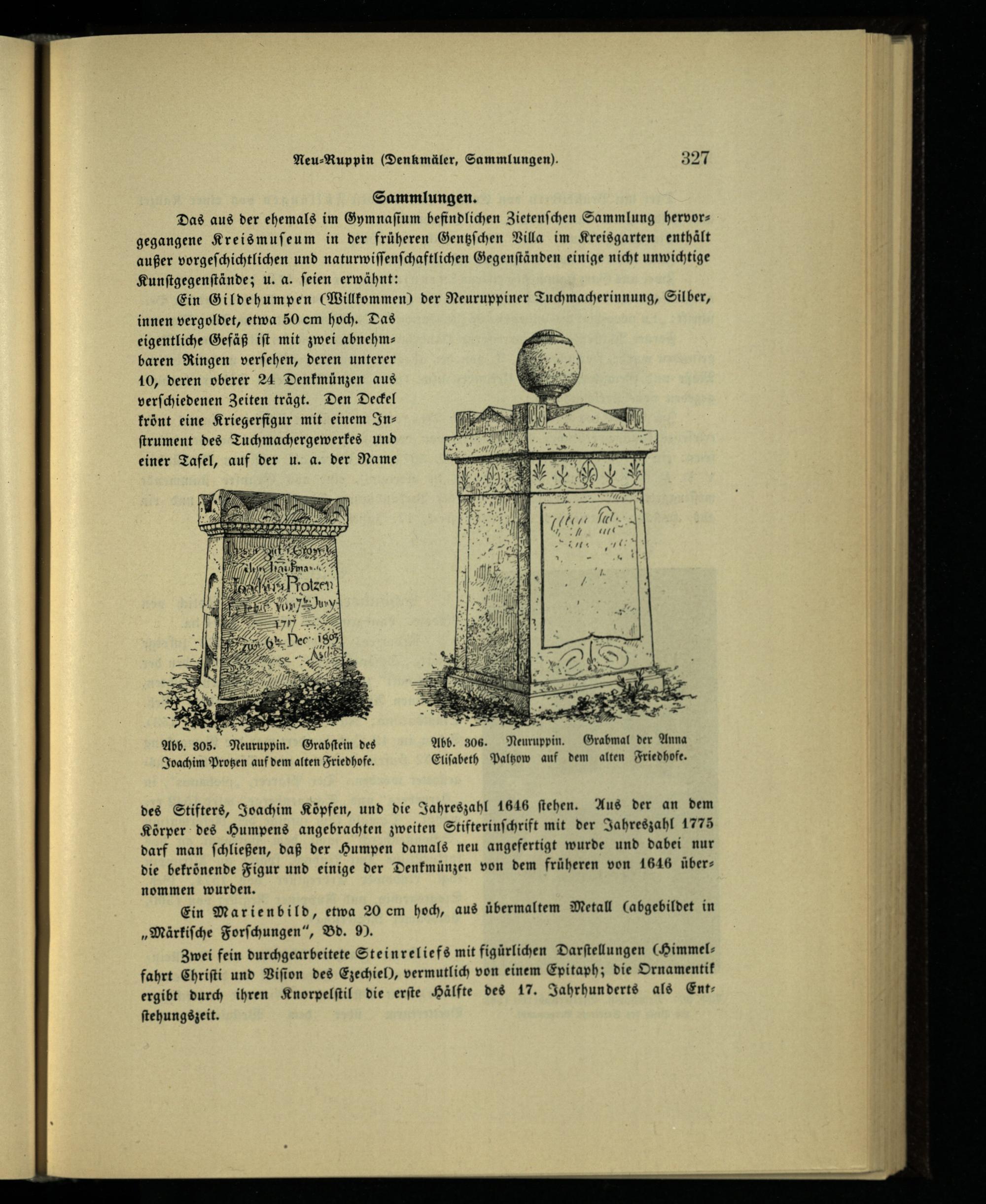 Abb. 305. Neuruppin . Grabſtein des Abb. 306. Neuruppin. Grabmal der Anna Joachim Protzen auf dem alten Friedhofe. Eliſabeth Paltzow auf dem alten Friedhofe.