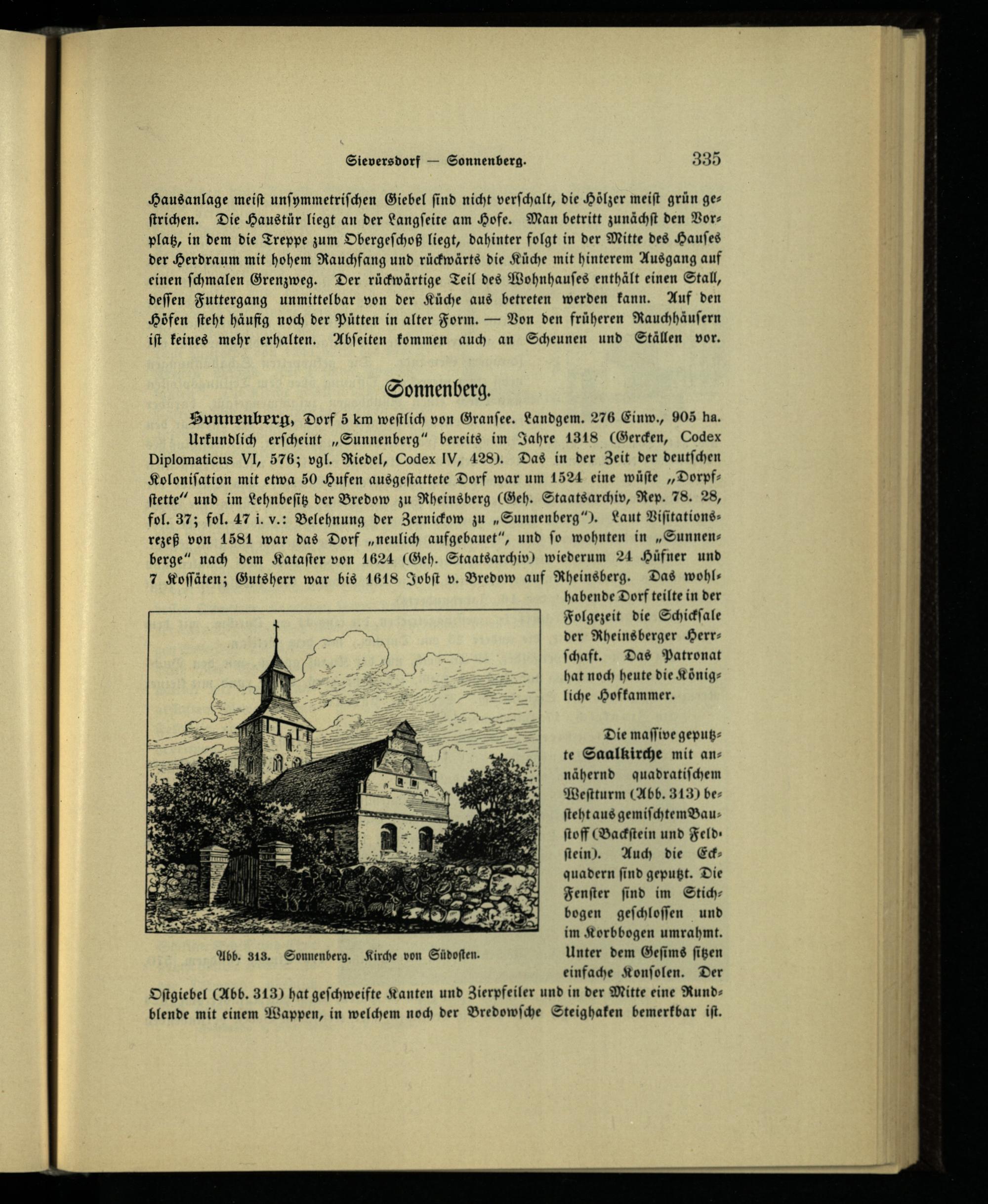 Die maſſive geputzte Saalkirche mit annähernd quadratiſchem Weſtturm(Abb. 313) beſteht aus gemiſchtem Bauſtoff(Backſtein und Feld: ſtein). Auch die Eckquadern ſind geputzt. Die Fenſter ſind im Stichbogen geſchloſſen und im Korbbogen umrahmt.