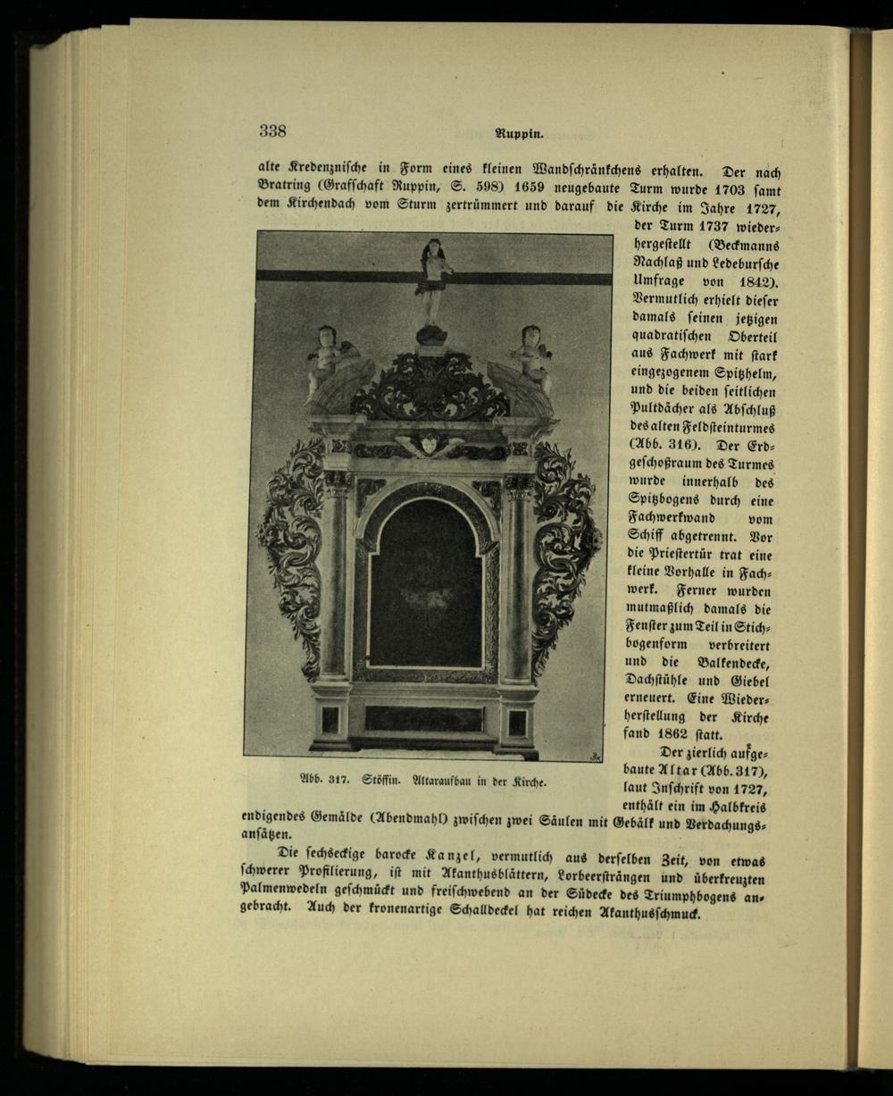 alte Kredenzniſche in Form eines kleinen Wandſchränkchens erhalten. Der nach Bratring(Grafſchaft Ruppin , S. 598) 1659 neugebaute Turm wurde 1703 ſamt dem Kirchendach vom Sturm zertrümmert und darauf die Kirche im Jahre 1727, der Turm 1737 wiederhergeſtellt(Beckmanns Nachlaß und Ledeburſche Umfrage von 1842). Vermutlich erhielt dieſer damals ſeinen jetzigen quadratiſchen Oberteil aus Fachwerk mit ſtark eingezogenem Spitzhelm, und die beiden ſeitlichen Pultdächer als Abſchluß des alten Feldſteinturmes (Abb. 316). Der Erdgeſchoßraum des Turmes wurde innerhalb des Spitzbogens durch eine Fachwerkwand vom Schiff abgetrennt. Vor die Prieſtertür trat eine kleine Vorhalle in Fach: werk. Ferner wurden mutmaßlich damals die Fenſter zum Teil in Stichbogenform verbreitert und die Balkendecke, Dachſtühle und Giebel erneuert. Eine Wiederherſtellung der Kirche fand 1862 ſtatt.