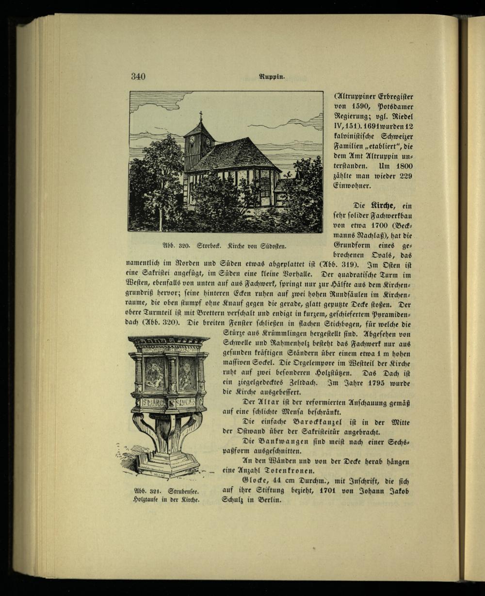 Abb. 320. Storbeck. Kirche von Südoſten. Grundform eines ge— brochenen Ovals, das namentlich im Norden und Süden etwas abgeplattet iſt(Abb. 319). Im Oſten iſt eine Sakriſtei angefügt, im Süden eine kleine Vorhalle. Der quadratiſche Turm im Weſten, ebenfalls von unten auf aus Fachwerk, ſpringt nur zur Hälfte aus dem Kirchen— grundriß hervor; feine hinteren Ecken ruhen auf zwei hohen Rundſäulen im Kirchen raume, die oben ſtumpf ohne Knauf gegen die gerade, glatt geputzte Decke ſtoßen. Der obere Turmteil iſt mit Brettern verſchalt und endigt in kurzem, geſchiefertem Pyramidendach(Abb. 320). Die breiten Fenſter ſchließen in flachen Stichbogen, für welche die Stürze aus Krümmlingen hergeſtellt ſind. Abgeſehen von Schwelle und Rahmenholz beſteht das Fachwerk nur aus gefunden kräftigen Ständern über einem etwa 1 m hohen maſſiven Sockel. Die Orgelempore im Weſtteil der Kirche ruht auf zwei beſonderen Holzſtützen. Das Dach iſt ein ziegelgedecktes Zeltdach. Im Jahre 1795 wurde die Kirche ausgebeſſert. Der Altar iſt der reformierten Anſchauung gemäß auf eine ſchlichte Menſa beſchränkt. Die einfache Barockkanzel iſt in der Mitte der Oſtwand über der Sakriſteitür angebracht. Die Bankwangen ſind meiſt nach einer Sechs: paßform ausgeſchnitten. An den Wänden und von der Decke herab hängen eine Anzahl Totenkronen. Glocke, 44 em Durchm., mit Inſchrift, die ſich Abb. 321. Strubenſee. auf ihre Stiftung bezieht, 1701 von Johann Jakob Holztaufe in der Kirche. Schulz in Berlin .