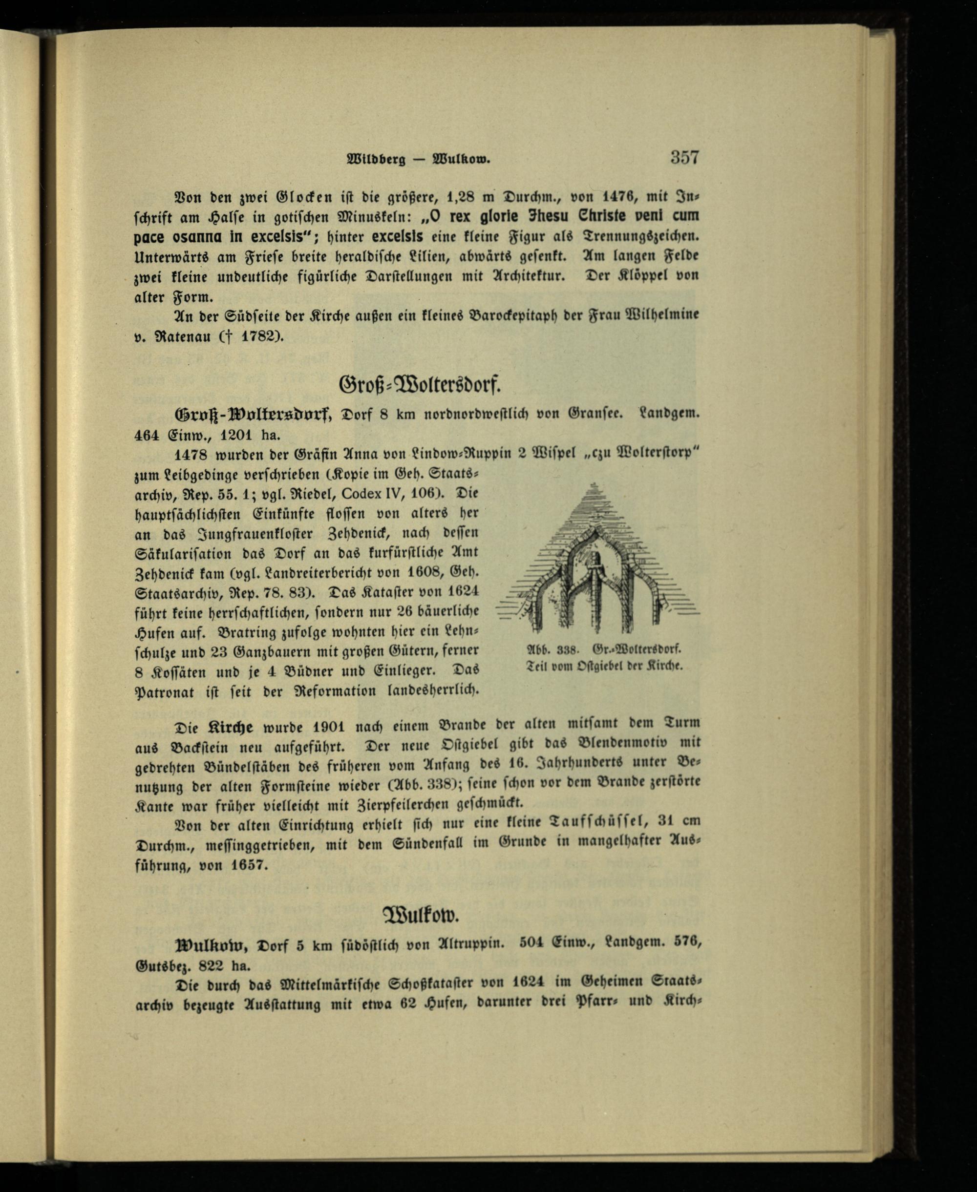 Groß Woltersdorf, Dorf 8 km nordnordweſtlich von Granſee . Landgem. 464 Einw., 1201 ha. 1478 wurden der Gräfin Anna von Lindow⸗Ruppin 2 Wiſpel„czu Wolterſtorp“ zum Leibgedinge verſchrieben(Kopie im Geh. Staatsarchiv, Rep. 55. 1; vgl. Riedel, Codex IV , 106). Die hauptſächlichſten Einkünfte floſſen von alters her an das Jungfrauenkloſter Zehdenick , nach deſſen Säkulariſation das Dorf an das kurfürſtliche Amt Zehdenick kam(vgl. Landreiterbericht von 1608, Geh. Staatsarchiv, Rep. 78. 83). Das Kataſter von 1624 führt keine herrſchaftlichen, ſondern nur 26 bäuerliche Hufen auf. Bratring zufolge wohnten hier ein Lehn⸗| ö ſchulze und 23 Ganzbauern mit großen Gütern, ferner Abb. 338. Gr. Woltersdorf. 8 Koſſäten und je 4 Büdner und Einlieger. Das Teil vom Oſtgiebel der Kirche. Patronat iſt ſeit der Reformation landesherrlich.