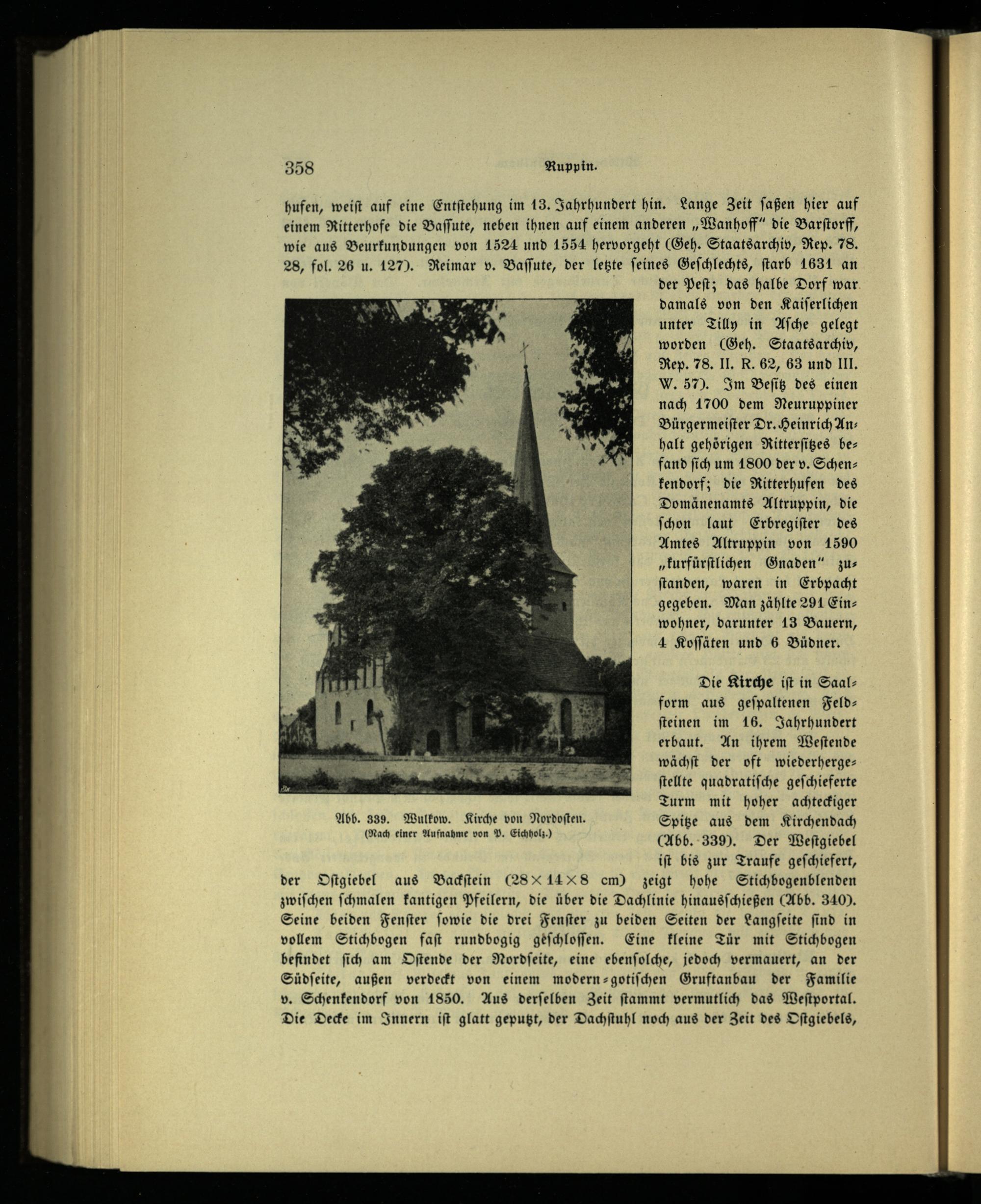 hufen, weiſt auf eine Entſtehung im 13. Jahrhundert hin. Lange Zeit ſaßen hier auf einem Ritterhofe die Baſſute, neben ihnen auf einem anderen„Wanhoff“ die Barſtorff, wie aus Beurkundungen von 1524 und 1554 hervorgeht(Geh. Staatsarchiv, Rep. 78. 28, fol. 26 u. 127). Reimar v. Baſſute, der letzte feines Geſchlechts, ſtarb 1631 an der Peſt; das halbe Dorf war. damals von den Kaiſerlichen unter Tilly in Aſche gelegt worden(Geh. Staatsarchiv, Rep. 78. II. R. 62, 63 und III. V. 57). Im Beſitz des einen nach 1700 dem Neuruppiner Bürgermeiſter Dr. Heinrich An: halt gehörigen Ritterſitzes bes fand ſich um 1800 der v. Schenkendorf; die Ritterhufen des Domänenamts Altruppin, die ſchon laut Erbregiſter des Amtes Altruppin von 1590 „kurfürſtlichen Gnaden“ zuſtanden, waren in Erbpacht gegeben. Man zählte 291 Einwohner, darunter 13 Bauern, 4 Koſſäten und 6 Büdner.