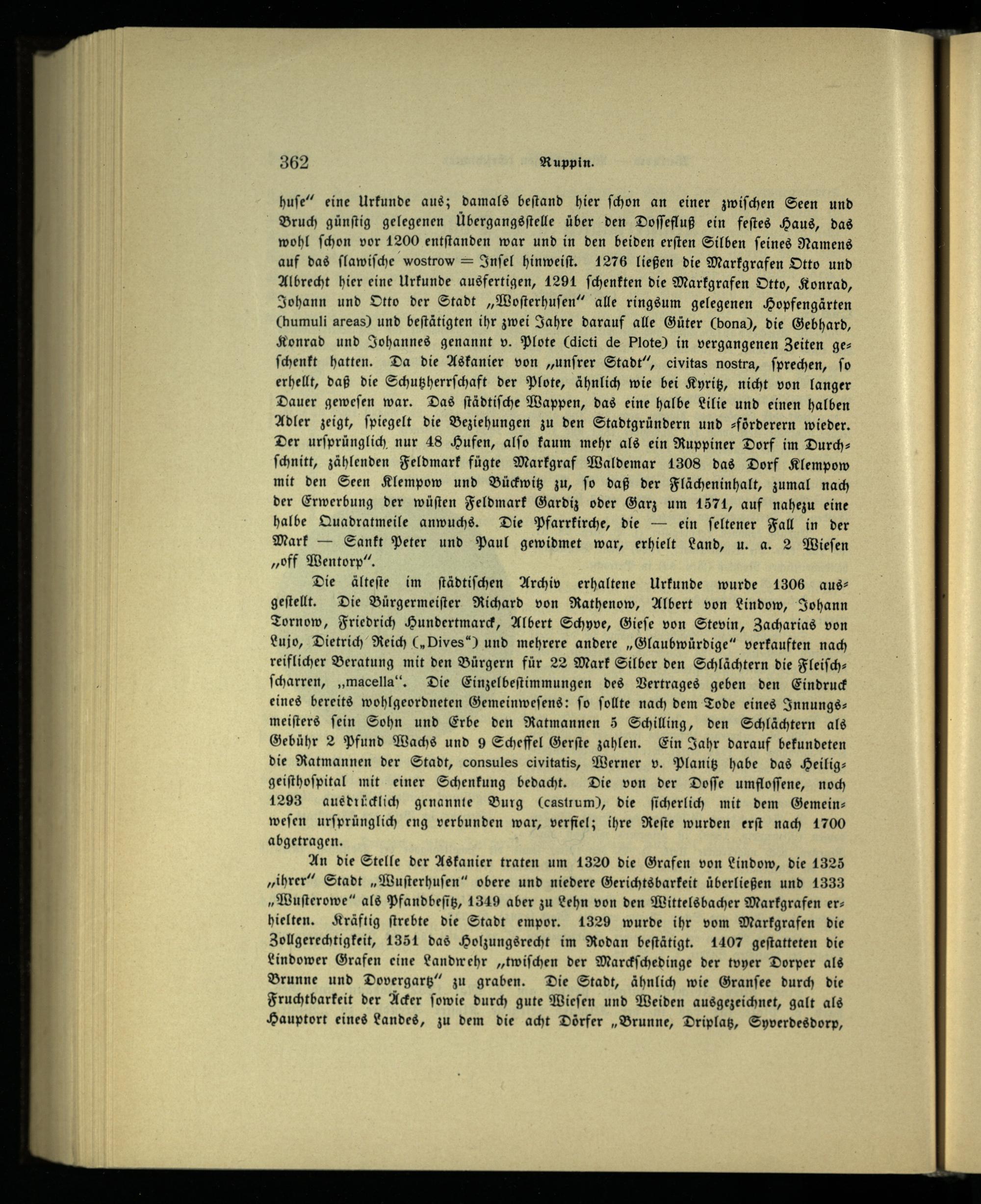 An die Stelle der Askanier traten um 1320 die Grafen von Lindow, die 1325 „ihrer“ Stadt„Wuſterhuſen “ obere und niedere Gerichtsbarkeit überließen und 1333 „Wuſterowe“ als Pfandbeſitz, 1349 aber zu Lehn von den Wittelsbacher Markgrafen er: hielten. Kräftig ſtrebte die Stadt empor. 1329 wurde ihr vom Markgrafen die Zollgerechtigkeit, 1351 das Holzungsrecht im Rodan beſtätigt. 1407 geſtatteten die Lindower Grafen eine Landwehr„twiſchen der Marckſchedinge der tvyer Dorper als Brunne und Dovergartz“ zu graben. Die Stadt, ähnlich wie Granſee durch die Fruchtbarkeit der Acker ſowie durch gute Wieſen und Weiden ausgezeichnet, galt als Hauptort eines Landes, zu dem die acht Dörfer„Brunne, Driplatz, Syverdes dorp,