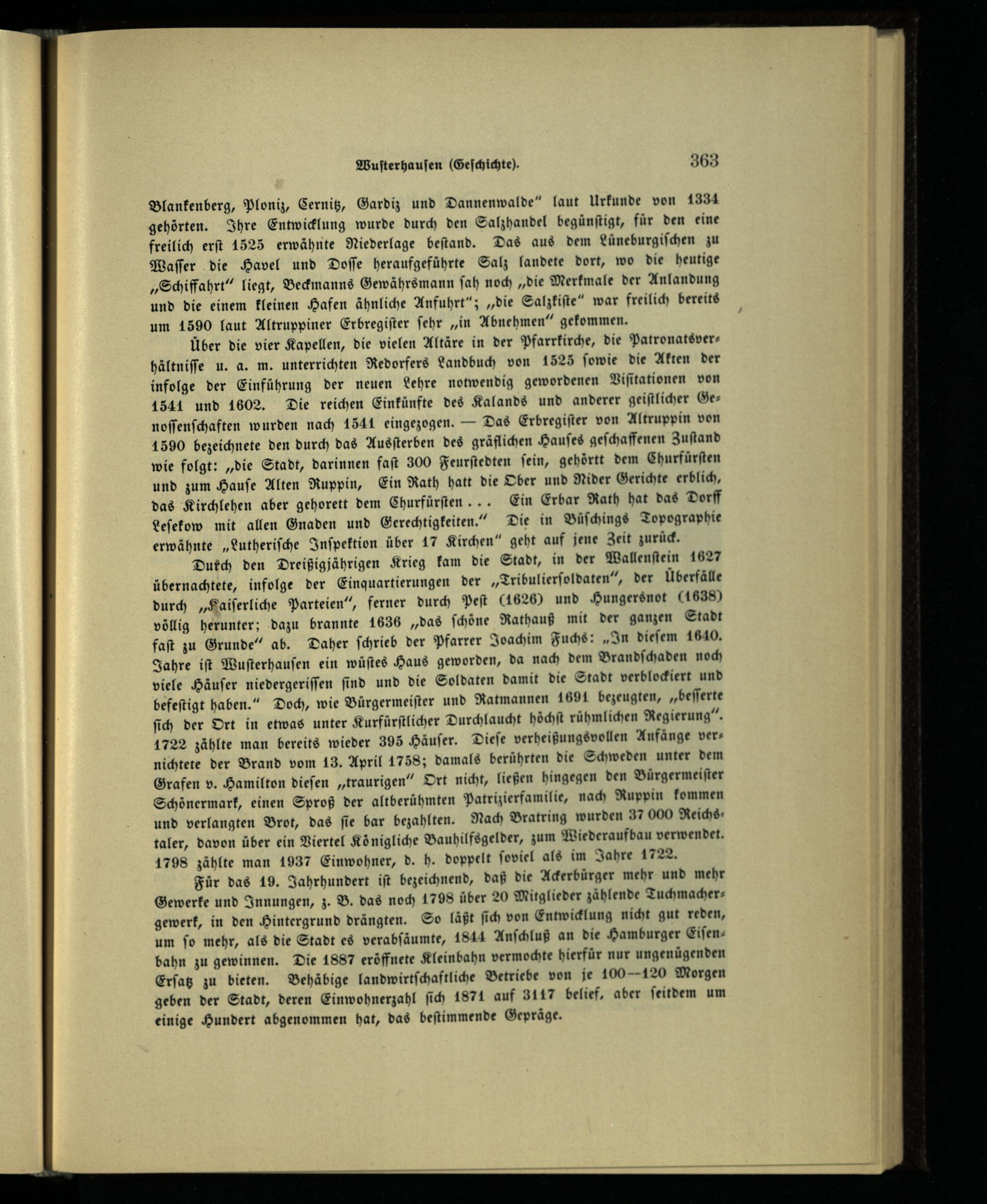 Dutch den Dreißigjährigen Krieg kam die Stadt, in der Wallenſtein 1627 übernachtete, infolge der Einquartierungen der„Tribulierſoldaten“, der Überfälle durch„Kaiſerliche Parteien“, ferner durch Peſt(1626) und Hungersnot(1638) völlig herunter; dazu brannte 1636„das ſchöne Rathauß mit der ganzen Stadt faſt zu Grunde“ ab. Daher ſchrieb der Pfarrer Joachim Fuchs:„In dieſem 1640, Jahre iſt Wuſterhauſen ein wüſtes Haus geworden, da nach dem Brandſchaden noch viele Häuſer niedergeriſſen find und die Soldaten damit die Stadt verblockiert und befeſtigt haben.“ Doch, wie Bürgermeiſter und Ratmannen 1691 bezeugten,„beſſerte ſich der Ort in etwas unter Kurfürſtlicher Durchlaucht höchſt rühmlichen Regierung“. 1722 zählte man bereits wieder 395 Häuſer. Dieſe verheißungsvollen Anfänge vernichtete der Brand vom 13. April 1758; damals berührten die Schweden unter dem Grafen v. Hamilton dieſen„traurigen“ Ort nicht, ließen hingegen den Bürgermeiſter Schönermark , einen Sproß der altberühmten Patrizierfamilie, nach Ruppin kommen und verlangten Brot, das ſie bar bezahlten. Nach Bratring wurden 37 000 Reichs: taler, davon über ein Viertel Königliche Bauhilfsgelder, zum Wiederaufbau verwendet. 1798 zählte man 1937 Einwohner, d. h. doppelt ſoviel als im Jahre 1722.