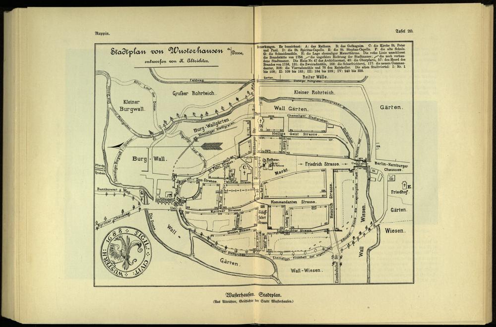 Bemerkungen. Es bezeichnet: A: das Rathaus. B: das Gefängniss. O: die Kirche St. Peter und Paul. D: die St. Spiritus Capelle. E: die St. Stephan- Capelle. E: die alte Schule. G: die Schneidemühle. Hf: die Lage ehemaliger Mauerthürme. Die rothe Linie umschliesst die Brandstätte von 1758.„- die ungefähre Richtung der Stadtmauer; die noch vorhandene Stadtmauer. Die Haus Nr. 47 das Archidiaconat, 48: die Oberpfarrè, 57: den Heerd des Brandes von 1758, 131: die Zweiradmühle, 168: die Scharfrichterei, 177: die neuere Commandantur, 308: die Vierrademühle und 76 den Ratskeller. Die alten Stadtviertel: I: Nr. 1