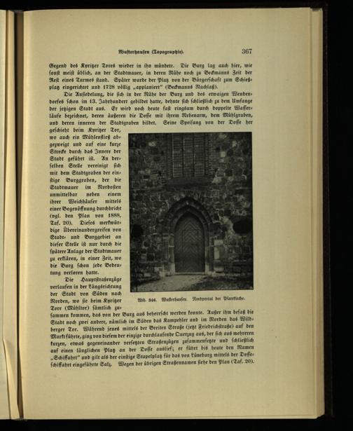 Norden, wo ſie beim Kyritzer Abb. 816. Wuſterhauſen. Nordportal der Pfarrkirche. Tore(Mühltor) ſämtlich zu:;; ſammen kommen, das von der Burg aus beherrſcht werden konnte. Außer ihm beſaß die Stadt noch zwei andere, nämlich im Süden das Kampehler und im Norden das Wildberger Tor. Während jenes mittels der Breiten Straße(jetzt Friedrichſtraße) auf den Markt führte, ging von dieſem der einzige durchlaufende Querzug aus, der ſich aus mehreren kurzen, etwas gegeneinander verſetzten Straßenzügen zuſammenſetzte und ſchließlich auf einen länglichen Platz an der Doſſe auslief; er führt bis heute den Namen „Schiffahrt“ und gilt als der einſtige Stapelplatz für das von Lüneburg mittels der Doſſeſchiffahrt eingeführte Salz. Wegen der übrigen Straßennamen ſiehe den Plan(Taf. 20).