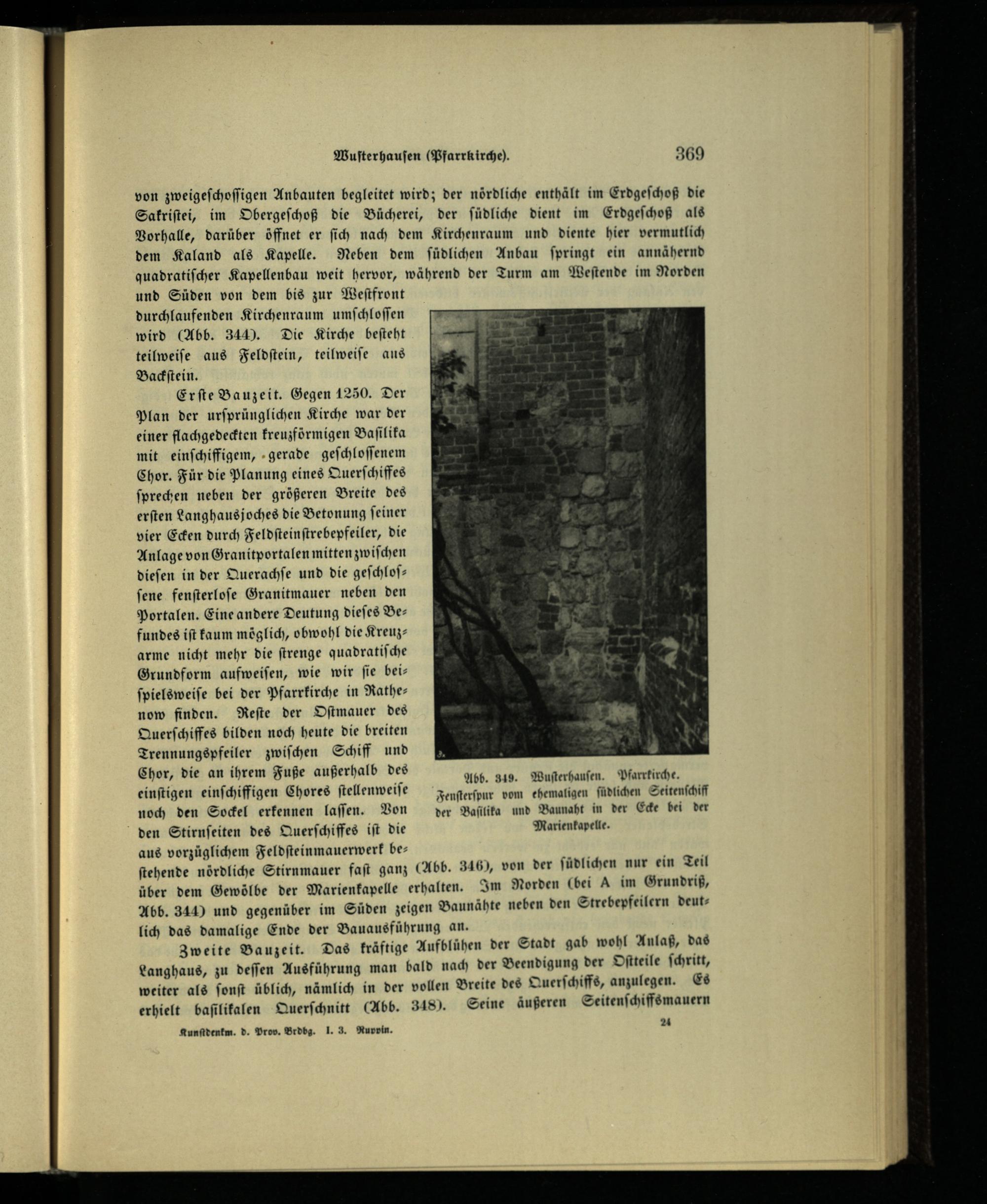 Erſte Bauzeit. Gegen 1250. Der Plan der urſprünglichen Kirche war der einer flachgedeckten kreuzförmigen Baſilika mit einſchiffigem, gerade geſchloſſenem Chor. Für die Planung eines Querſchiffes ſprechen neben der größeren Breite des erſten Langhausjoches die Betonung ſeiner vier Ecken durch Feldſteinſtrebepfeiler, die Anlage von Granitportalen mitten zwiſchen dieſen in der Querachſe und die geſchloſſene fenſterloſe Granitmauer neben den Portalen. Eine andere Deutung dieſes Befundes iſt kaum möglich, obwohl die Kreuzarme nicht mehr die ſtrenge quadratiſche Grundform aufweiſen, wie wir ſie bei— ſpielsweiſe bei der Pfarrkirche in Rathe now finden. Reſte der Oſtmauer des Querſchiffes bilden noch heute die breiten Trennungspfeiler zwiſchen Schiff und Chor, die an 2 Fuße anßerbalb des Abb. 319. Wuſterhauſen. Pfarrkirche. einſtigen einſchiffigen Chores ſtellenweiſe Fenſterſpur vom ehemaligen ſudlichen Seitenſchiff noch den Sockel erkennen laſſen. Von der Baſilika und Baunaht in der Ecke bei der den Stirnſeiten des Querſchiffes iſt die Marienkapelle. aus vorzüglichem Feldſteinmauerwerk beſtehende nördliche Stirnmauer faſt ganz(Abb. 346), von der füdlichen nur ein Teil über dem Gewölbe der Marienkapelle erhalten. Im Norden(bei A im Grundriß, Abb. 344) und gegenüber im Süden zeigen Baunähte neben den Strebepfeilern deutlich das damalige Ende der Bauausführung an.