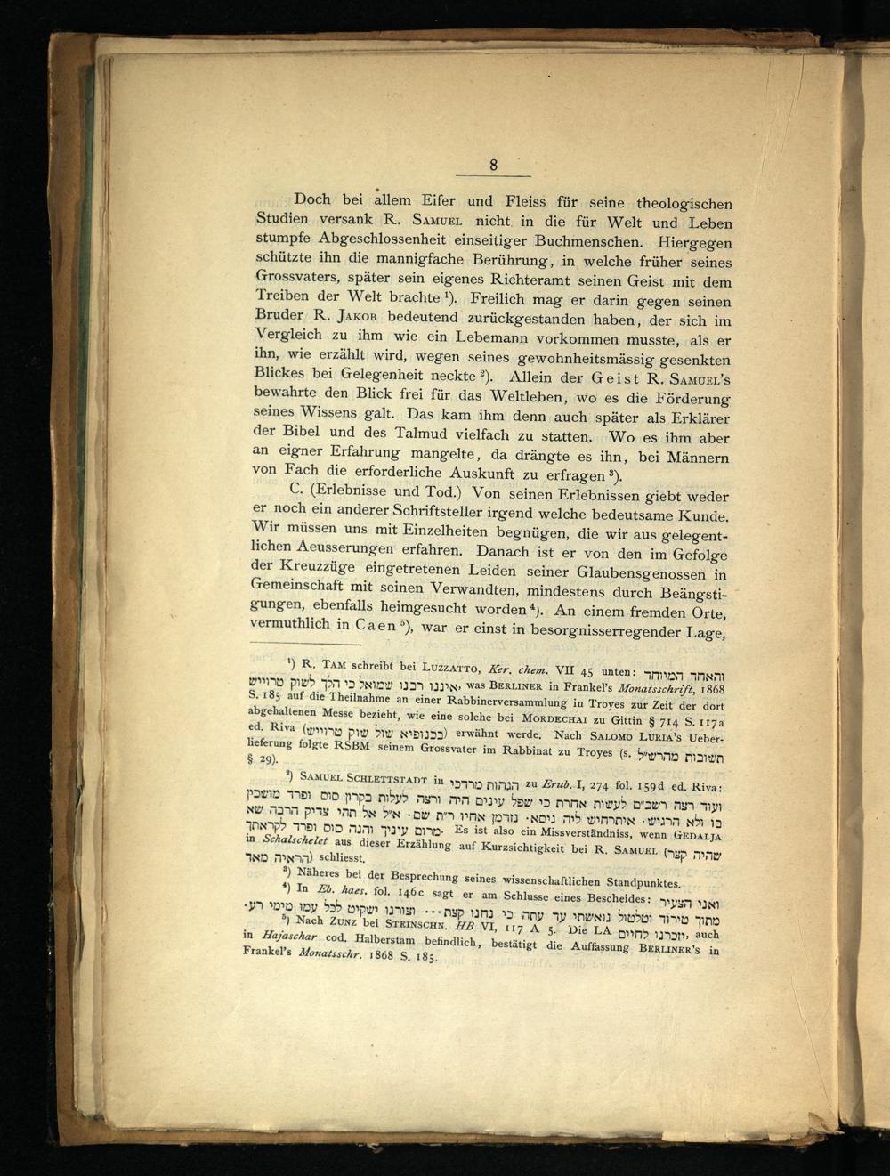 Doch bei allem Eifer und Fleiss für seine theologischen Studien versank R., SamverL nicht. in die für Welt und Leben stumpfe Abgeschlossenheit einseitiger Buchmenschen. Hiergegen schützte ihn die mannigfache Berührung, in welche früher seines Grossvaters, später sein eigenes Richteramt seinen Geist mit dem Treiben der Welt brachte!). Freilich mag er darin gegen seinen Bruder, R. Jakos bedeutend zurückgestanden haben, der sich im Vergleich zu ihm wie ein Lebemann vorkommen musste, ‚als er ihn, wie erzählt wird, wegen seines gewohnheitsmässig gesenkten Blickes bei Gelegenheit neckte?). Allein der Geist R. Samvzı’s bewahrte den Blick frei für das Weltleben, wo es die Förderung seines Wissens galt. Das kam ihm denn.auch später als Erklärer der Bibel und des Talmud vielfach zu statten... Wo.es ihm ‚aber an eigner Erfahrung mangelte, da drängte es ihn, bei Männern von Fach die erforderliche Auskunft zu erfragen?).