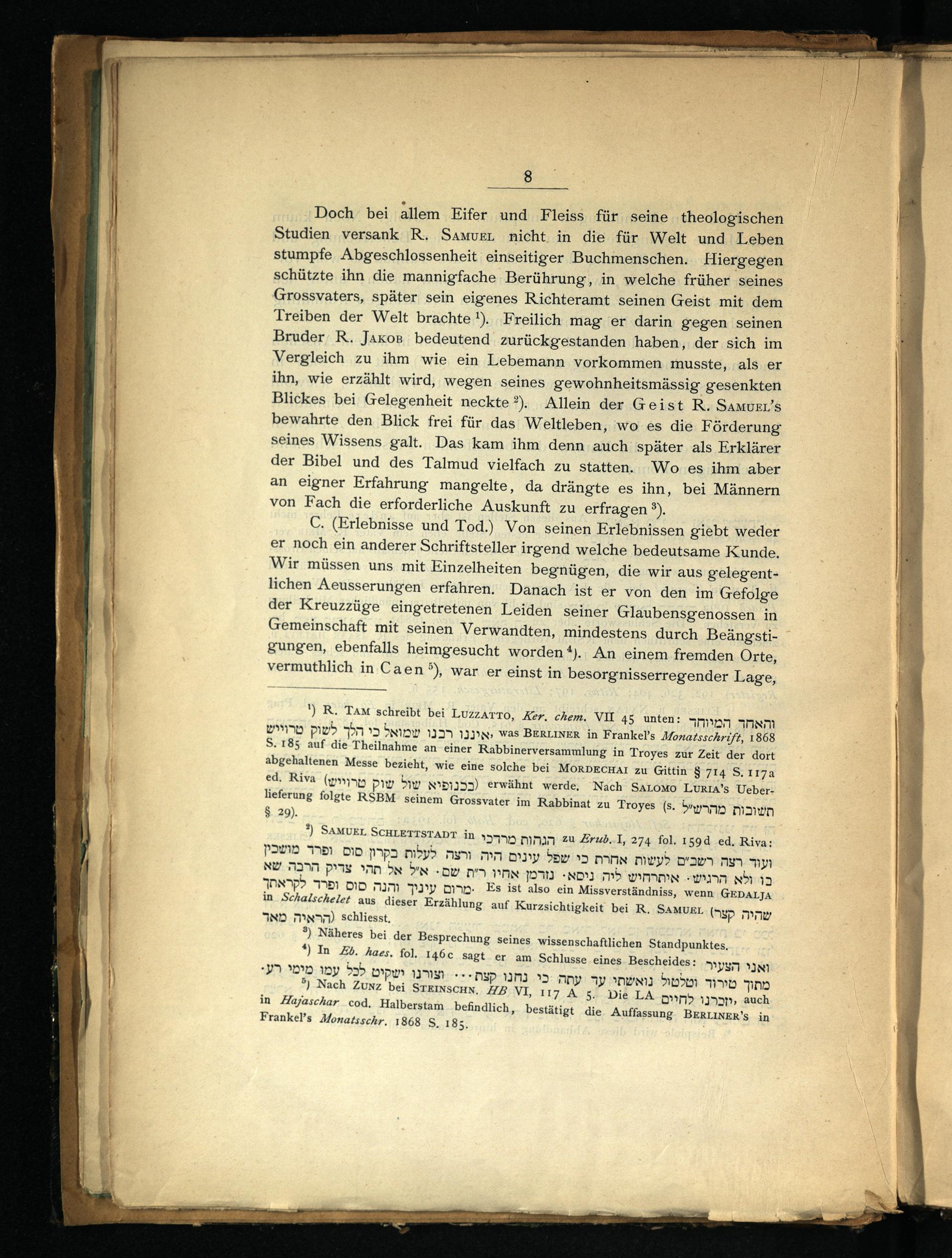 C.(Erlebnisse und Tod.) Von seinen Erlebnissen giebt weder er noch ein anderer Schriftsteller irgend welche bedeutsame Kunde. Wir müssen uns mit Einzelheiten begnügen, die wir aus gelegentlichen Aeusserungen erfahren. Danach ist er von den im Gefolge der Kreuzzüge eingetretenen Leiden seiner Glaubensgenossen in Gemeinschaft mit seinen Verwandten, mindestens durch Beängstigungen, ebenfalls heimgesucht worden*).. An einem fremden Orte, vermuthlich in Caen®), war er einst in besorgnisserregender Lage,