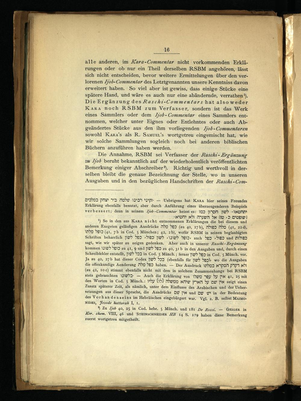 alle anderen, im Kara-Commentar nicht vorkommenden Erklärungen oder ob nur ein Theil derselben RSBM angehören, lässt sich nicht entscheiden, bevor weitere Ermittelungen über den verlorenen Z706-Commentar des Letztgenannten unsere Kenntniss davon erweitert haben. So viel aber ist gewiss, dass einige Stücke eine spätere Hand, und wäre es auch nur eine abändernde, verrathen‘). Die Ergänzung des Raschıi:-Commentars hat also weder KARA noch RSBM zum Verfasser, sondern ist das Werk eines Sammlers oder dem Zj06-Commentar eines Sammlers entnommen, welcher unter Eignes oder Entlehntes oder auch Abgeändertes Stücke aus den ihm vorliegenden Zj06-Commentaren sowohl Kara’s als R. SAamveL’s wortgetreu eingemischt hat, wie wir solche Sammlungen sogleich noch bei anderen biblischen Büchern anzuführen haben werden.