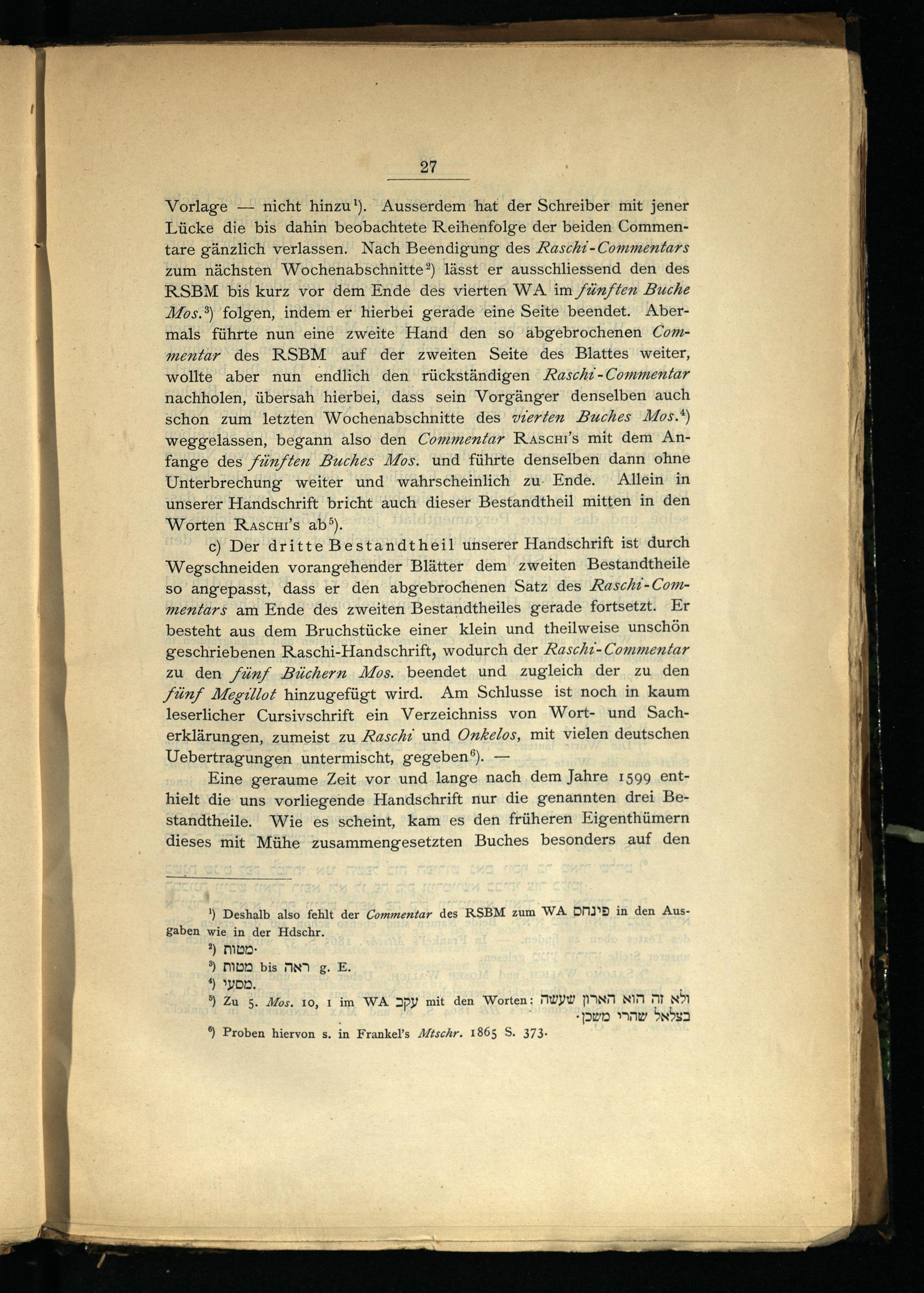 Vorlage— nicht hinzu‘). Ausserdem hat der Schreiber mit jener Lücke die bis dahin beobachtete Reihenfolge der beiden Commentare gänzlich verlassen. Nach Beendigung des Rascht-Commentars zum nächsten Wochenabschnitte?) lässt er ausschliessend den des RSBM bis kurz vor dem Ende des vierten WA. im /ünften Buche Mos.?) folgen, indem er hierbei gerade /eine Seite beendet. Abermals führte nun eine zweite Hand den so äbgebrochenen Commentar des RSBM auf der zweiten Seite des Blattes weiter, wollte aber nun endlich den rückständigen ARaschı-Commentar nachholen, übersah hierbei, dass sein Vorgänger denselben auch schon zum letzten Wochenabschnitte des‘ vierten Buches Mos.*) weggelassen, begann also den Commentar Rascmı’s mit dem Anfange des fünften Buches Mos. und führte denselben dann ohne Unterbrechung weiter und wahrscheinlich zu- Ende. Allein in unserer Handschrift bricht auch dieser Bestandtheil mitten in den Worten Rascur’s ab®).
