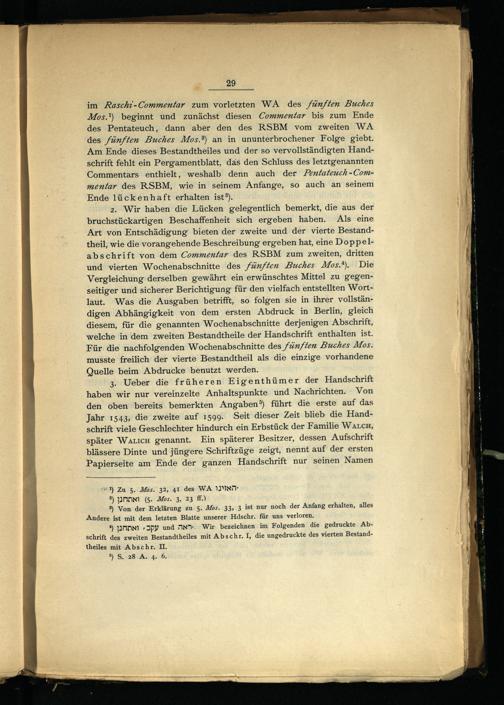 im Raschi-Commentar zum vorletzten WA des fünften Buches Mos.') beginnt und zunächst diesen Commentar bis zum Ende des Pentateuch, dann aber den des RSBM vom zweiten WA des fünften Buches Mos.?) an in ununterbrochener Folge giebt. Am Ende dieses Bestandtheiles und der so vervollständigten Handschrift fehlt ein Pergamentblatt, das den Schluss des letztgenannten Commentars enthielt, weshalb denn auch der Pentateuch-Commentar des RSBM, wie in seinem Anfange, so auch an seinem Ende lückenhaft erhalten ist®).