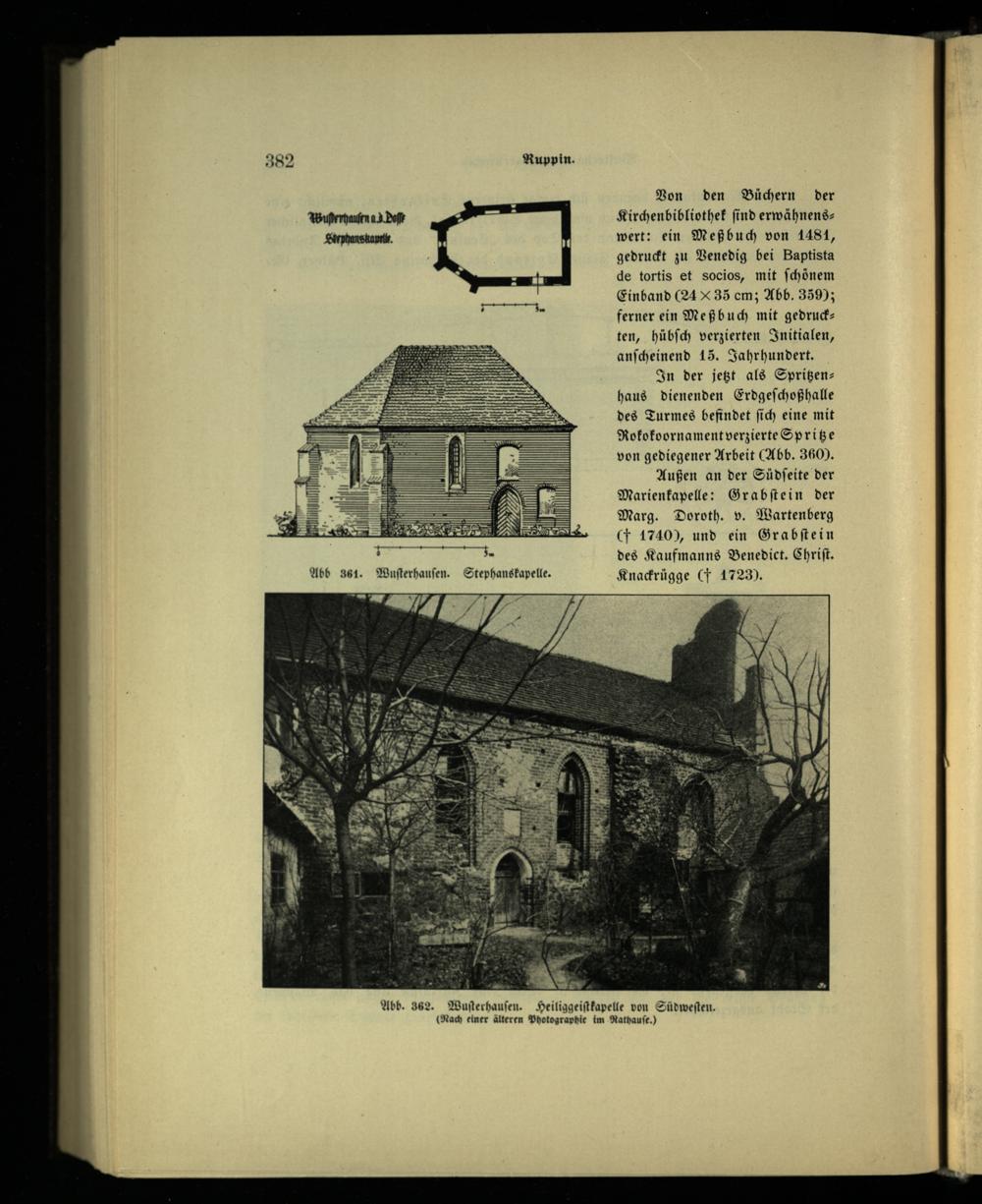 Außen an der Südſeite der Marienkapelle: Grabſtein der Marg. Doroth. v. Wartenberg (+ 1740), und ein Grabſtein des Kaufmanns Benedict. Chriſt. Abb 361. Wuſterhauſen. Stephanskapelle. Knackrügge(F 1723).
