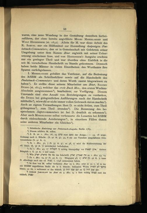 waren, eine neue Wendung in der Gestaltung desselben herbeizuführen, der oben bereits angeführte Mosts MENDELSSOHN und Worr HeIDEnHEmM(st. 1832). Allein für M. war diese Arbeit des R. SamvzerL nur ein Hülfsmittel zur Herstellung‘ desjenigen Pentateuch-Commentars, den er in Gemeinschaft mit Gelehrten seiner Umgebung unter dem Namen Biur zugleich mit seiner Uebersetzung‘ erscheinen liess, und von HEemenHeim’s Ausgabe erschien nur ein geringer Theil und war überdies ohne Einblick in die seit M. verschollene Handschrift zu Stande gekommen. Dennoch haben beide Männer in vielen Einzelheiten des Wortlautes ihre Spuren zurückgelassen.