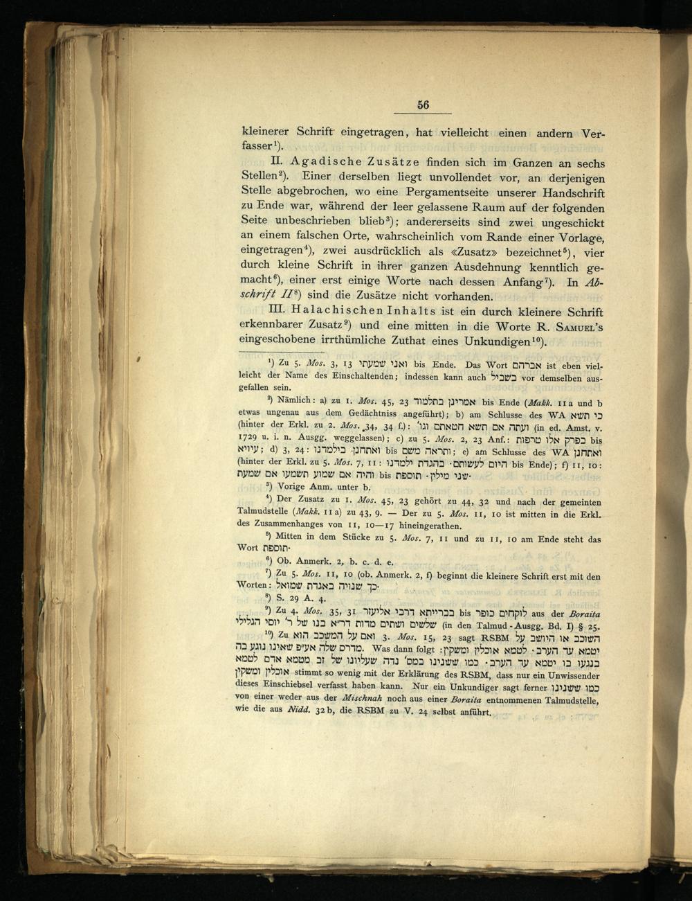 Il. Agadische Zusätze finden sich im Ganzen an sechs Stellen?). Einer derselben liegt unvollendet vor, an derjenigen Stelle abgebrochen, wo eine Pergamentseite unserer Handschrift zu Ende war, während der leer gelassene Raum auf der folgenden Seite unbeschrieben blieb?); andererseits sind zwei ungeschickt an einem falschen Orte, wahrscheinlich vom Rande einer Vorlage, eingetragen“), zwei ausdrücklich als«Zusatz» bezeichnet®), vier durch kleine Schrift in ihrer ganzen Ausdehnung kenntlich gemacht“), einer erst einige Worte nach dessen Anfang”). In A6schrift IT®) sind die Zusätze nicht vorhanden.