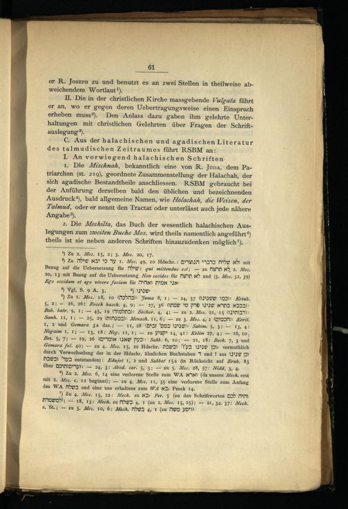 ı. Die Mischnah, bekanntlich eine von R. Jupa, dem Patriarchen(st. 219), geordnete Zusammenstellung: der Halachah, der sich agadische Bestandtheile anschliessen. RSBM gebraucht bei der Anführung derselben bald den üblichen und bezeichnenden Ausdruck*), bald allgemeine Namen, wie Halachah, die Weisen, der Talmud, oder er nennt den Tractat oder unterlässt auch jede nähere Angabe’).