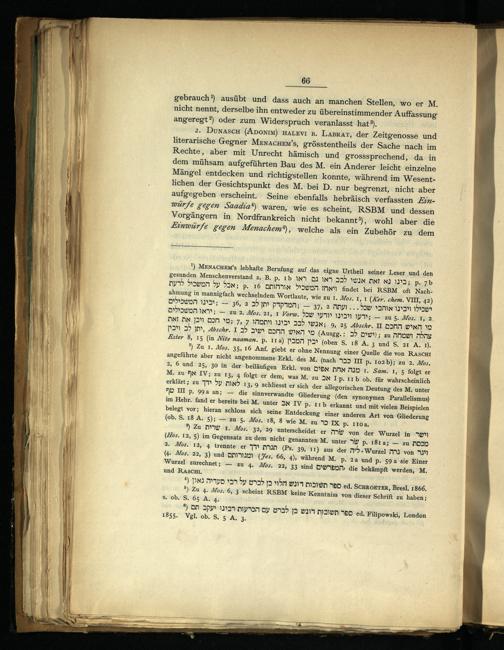 2. DvnAscH(ADonım) HALEVI B. LazraT, der Zeitgenosse und literarische Gegner MeEnAcHEw’s, grösstentheils der Sache nach im Rechte, aber mit Unrecht hämisch und grosssprechend, da in dem mühsam aufgeführten Bau des M. ein Anderer leicht einzelne Mängel entdecken und richtigstellen konnte, während im Wesentlichen der Gesichtspunkt des M.-bei D. nur begrenzt, nicht aber aufgegeben erscheint. Seine ebenfalls hebräisch verfassten Zynwürfe gegen Saadıa") waren, wie es scheint, RSBM und dessen Vorgängern in Nordfrankreich nicht bekannt”), wohl aber die Einwürfe gegen Menachem®), welche als ein Zubehör zu dem