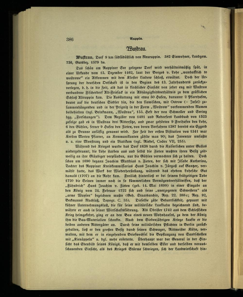 Wuſtrau , Dorf 9 km ſüdſüdöſtlich von Neuruppin . 582 Einwohner, Landgem. 736, Gutsbez. 1579 ha.